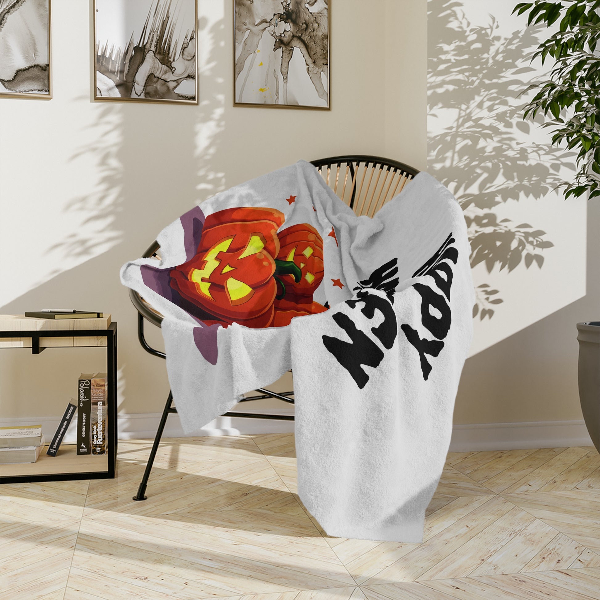Celebrate the most festive time of year with our Happy Halloween Pumpkin Patch Plush Blanket! This wonderfully soft and cozy throw features a cheerful illustration of a vibrant pumpkin patch, with a tall, smiling jack-o'-lantern wearing a classic witch's hat as the centerpiece. Surrounding it are an array of other glowing pumpkins, all set against a backdrop of twinkling stars. The words "Happy Halloween" boldly declare the season's greetings at the top. Perfect for adding a delightful and inviting touch to your home decor, this lightweight plush blanket is ideal for snuggling up on crisp autumn evenings, decorating your living room or bedroom, or as a joyful gift for any Halloween enthusiast. Made from premium, comfortable fabric, it offers exceptional warmth and a touch of playful charm, making it a must-have for celebrating the holiday.