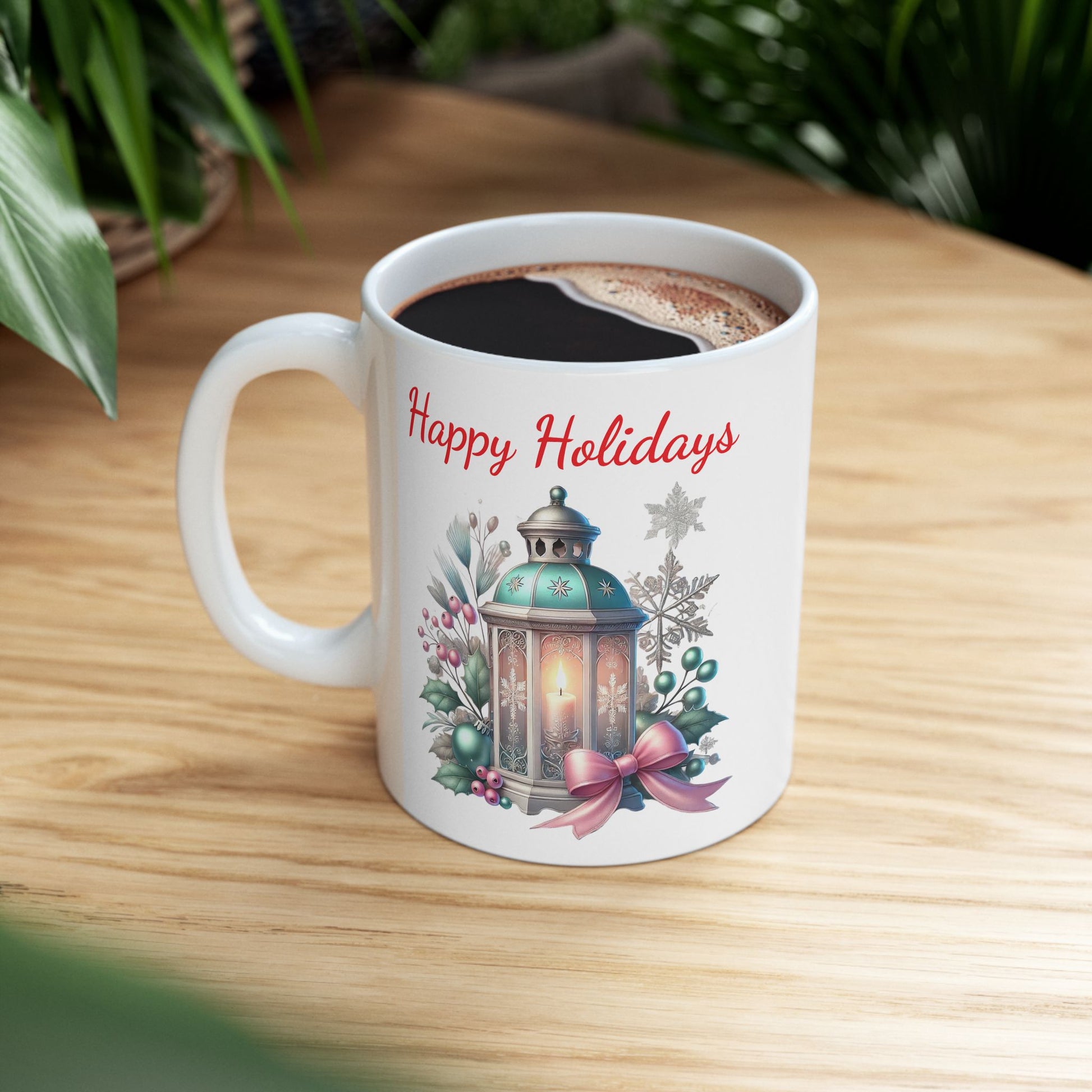 Illuminate your holiday season with our enchanting "Happy Holidays" coffee mug! This beautiful mug features a whimsical watercolor illustration of a glowing holiday lantern surrounded by festive greenery, berries, delicate snowflakes, and a charming pink bow. It's the perfect way to enjoy your favorite warm beverages during the chilly season and makes a thoughtful gift for anyone who loves festive decor and the cozy ambiance of winter. Crafted from durable white ceramic, this mug is both microwave and dishwasher safe for your convenience. Bring a touch of warm holiday glow to your home or office with this unique and beautiful mug!