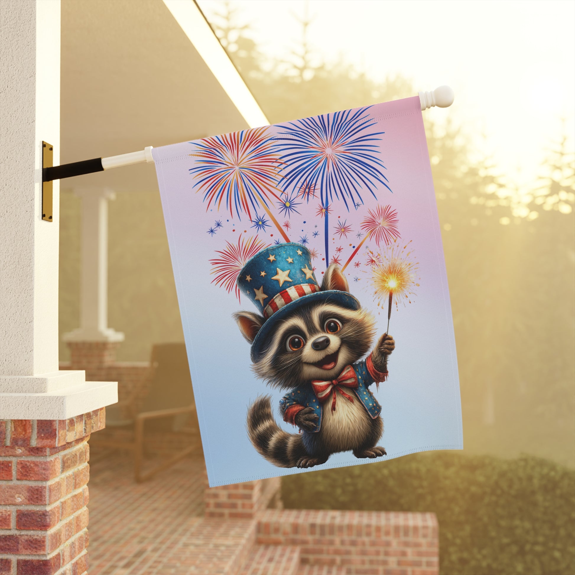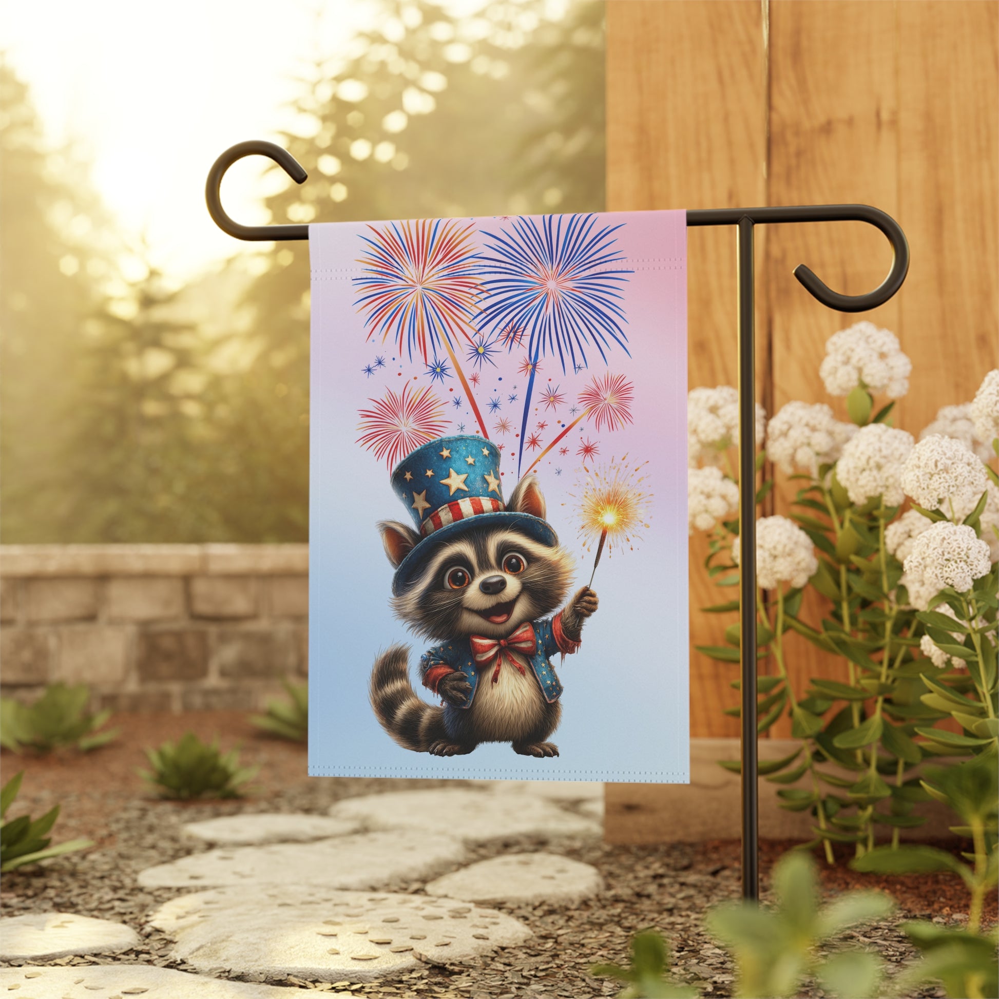 Light up your yard with our adorable happy raccoon garden flag! This unique design features a charming raccoon cheerfully holding a sparkler, bringing a festive and whimsical touch to your outdoor decor. Perfect for 4th of July celebrations or any time you want to add a little sparkle to your garden.