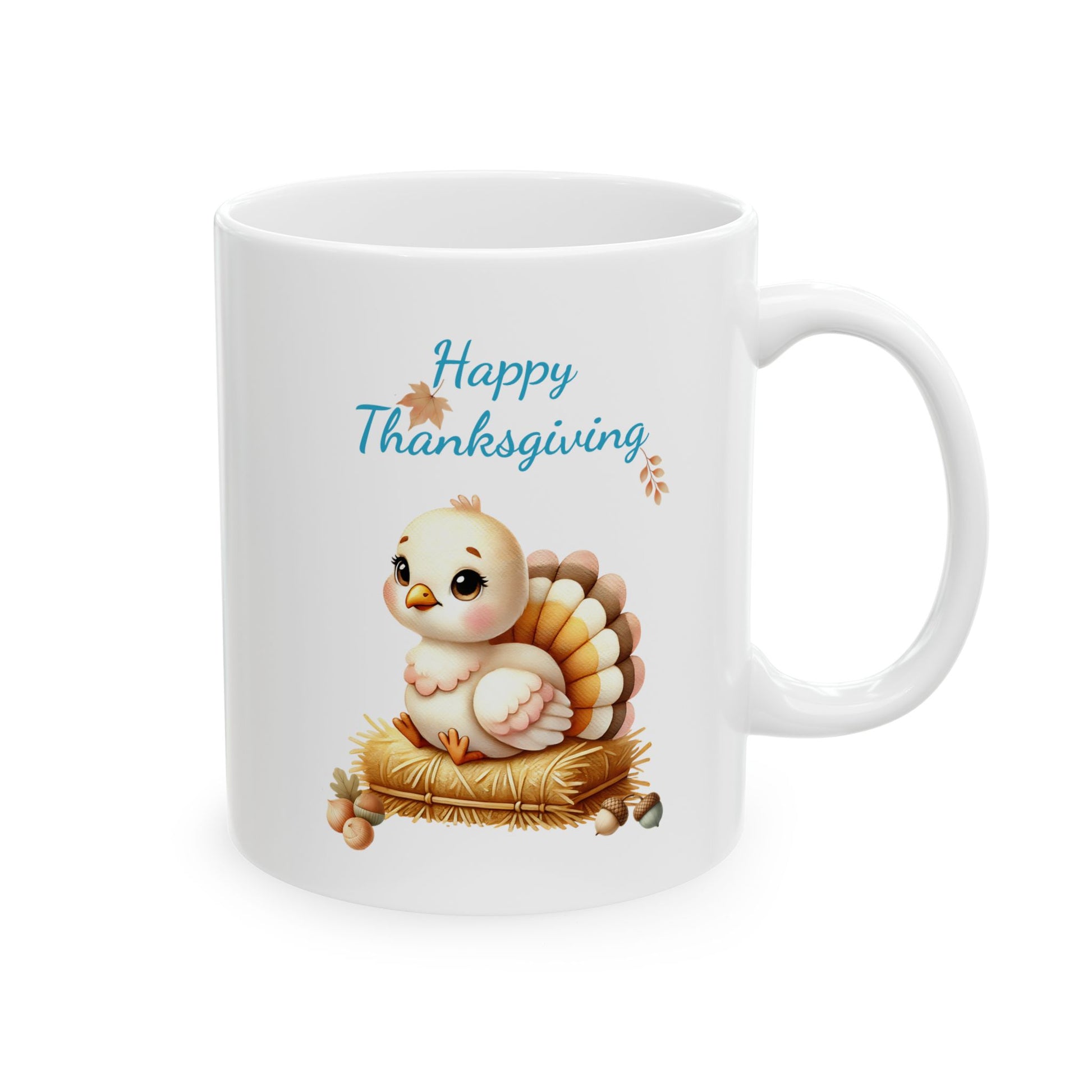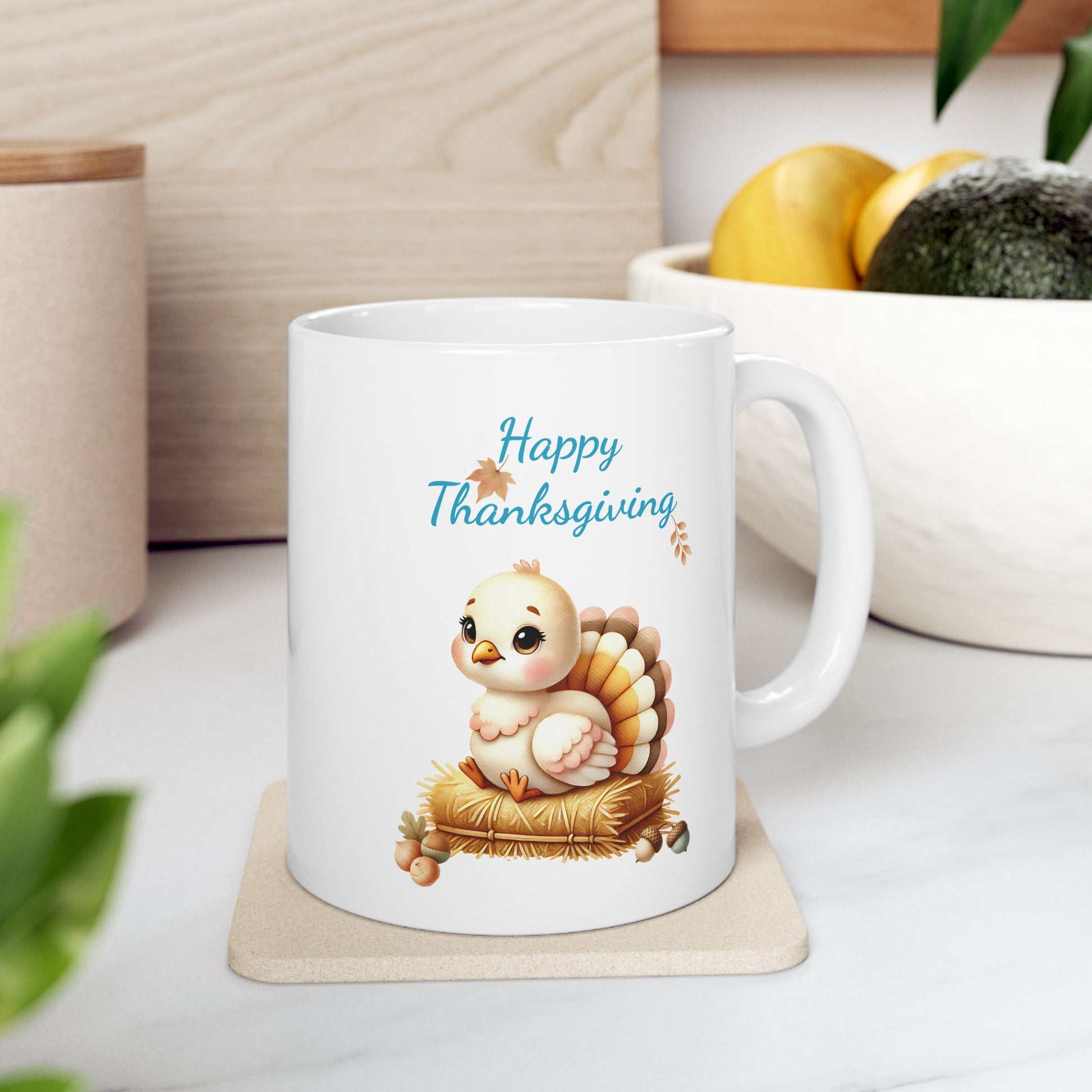 Start your day with a smile and a grateful heart using our adorable Happy Thanksgiving Cute Turkey Coffee Mug! This charming ceramic mug features a delightful illustration of a sweet baby turkey perched on a bale of hay, surrounded by autumn leaves and berries. The festive greeting 'Happy Thanksgiving' in a cheerful blue script completes this heartwarming design, making every sip a celebration.