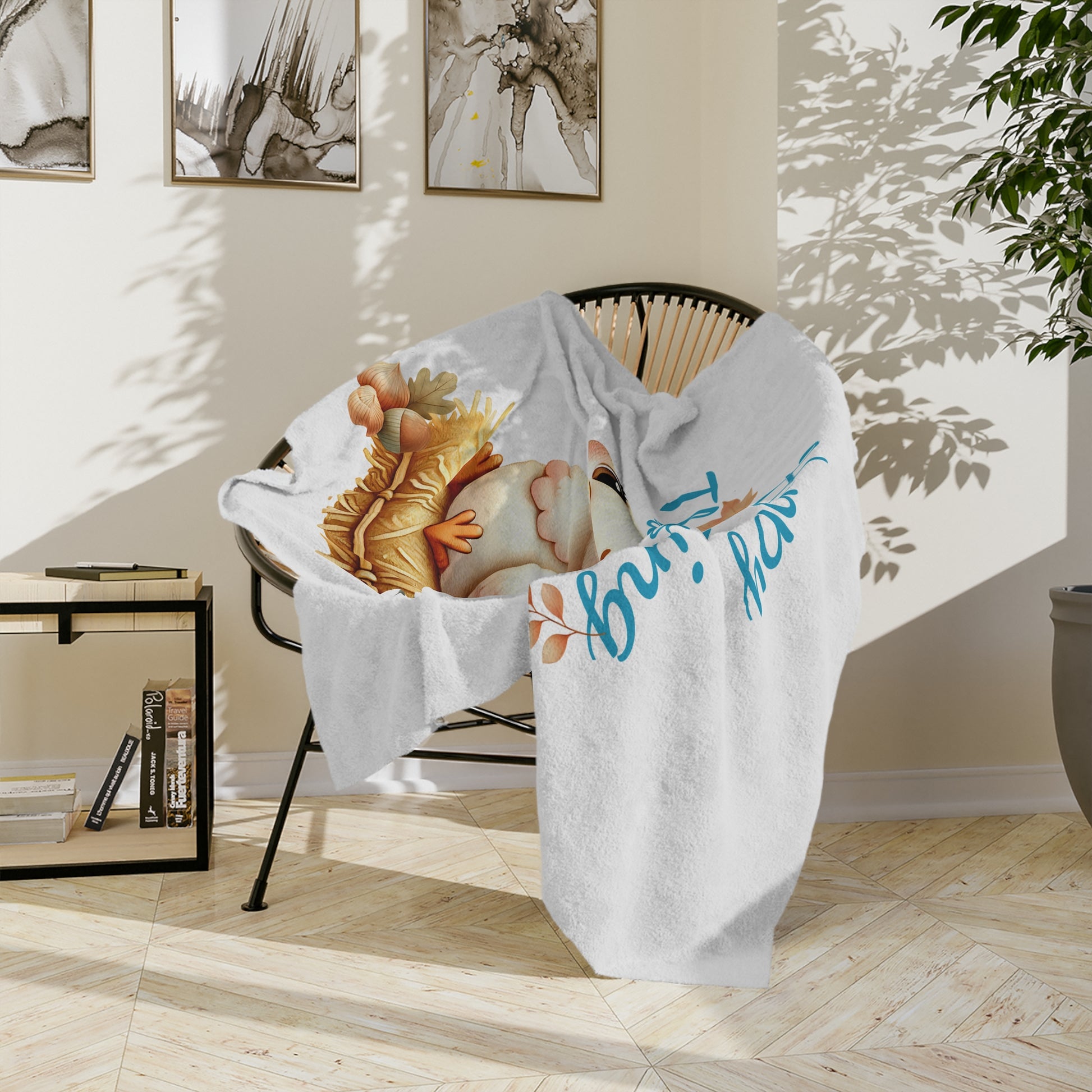 Wrap yourself in autumn warmth and gratitude with our adorable Happy Thanksgiving Cute Turkey Lightweight Velveteen Blanket! This incredibly soft and cozy throw features a heartwarming illustration of a sweet baby turkey perched on a cozy bale of hay, surrounded by whimsical autumn leaves and acorns. The cheerful greeting 'Happy Thanksgiving' in a delightful blue script completes this festive scene, making every snuggle a celebration of the season.
