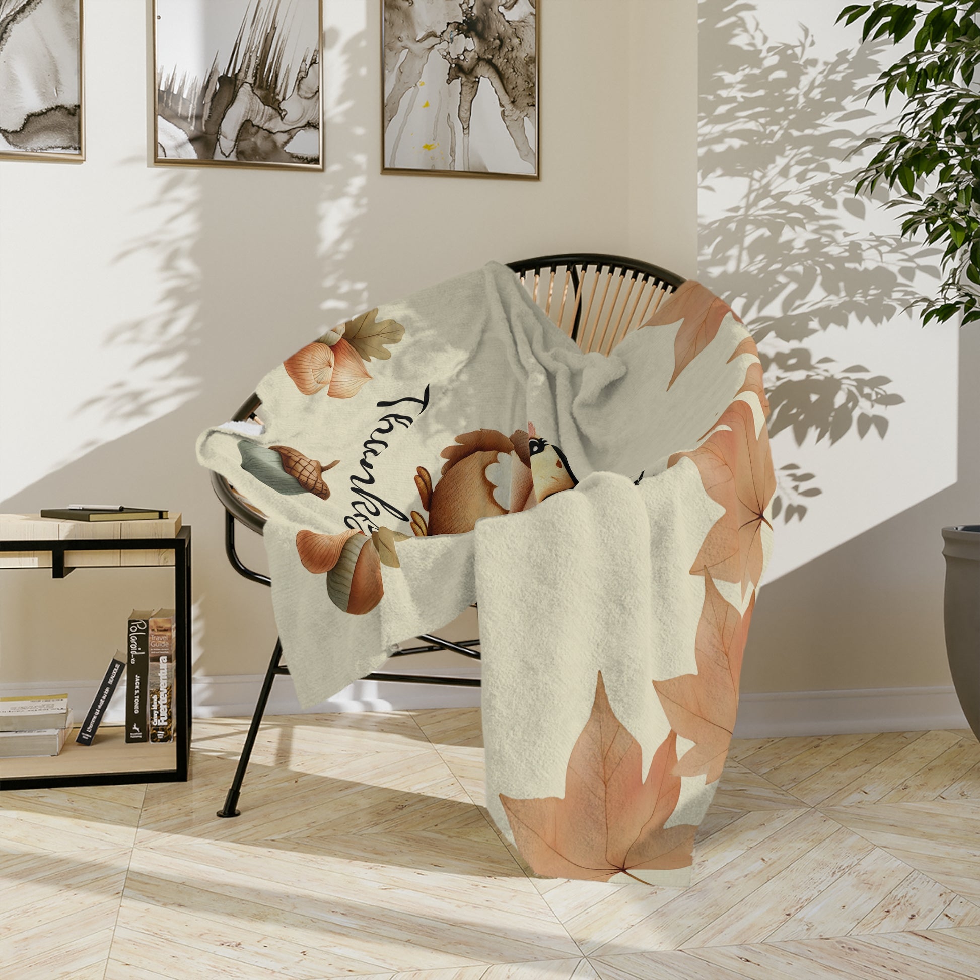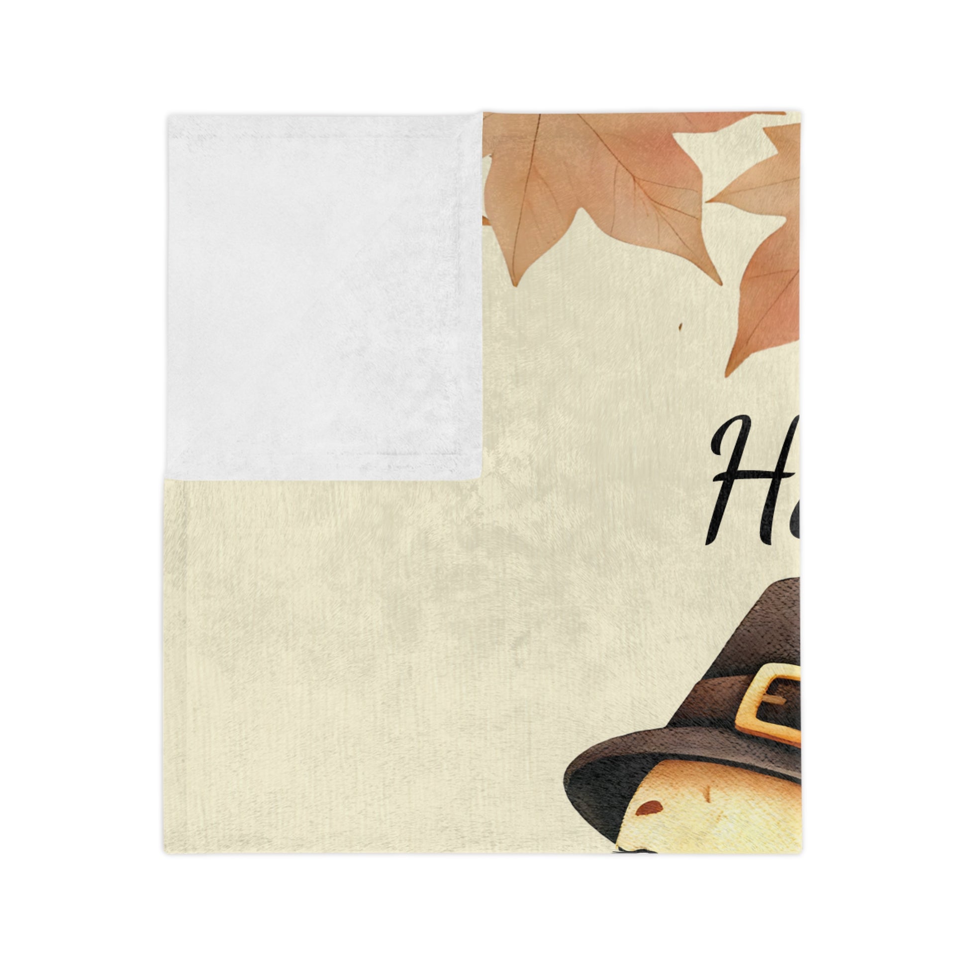Step back in time to the harvest feast with our charming "Happy Thanksgiving" velveteen blanket! This incredibly soft and plush throw features an adorable cartoon turkey, distinguished in a pilgrim hat adorned with a small flower. Below the festive greeting, a delightful arrangement of acorns adds to the autumnal charm. Surrounded by warm-toned maple leaves, this blanket is the perfect addition to your traditional fall and Thanksgiving decor. Made from luxurious velveteen, it offers unparalleled softness and warmth, ideal for cozy evenings, enhancing your seasonal home styling, or giving as a heartwarming gift to loved ones. Celebrate the spirit of Thanksgiving with a touch of historical whimsy and ultimate comfort!