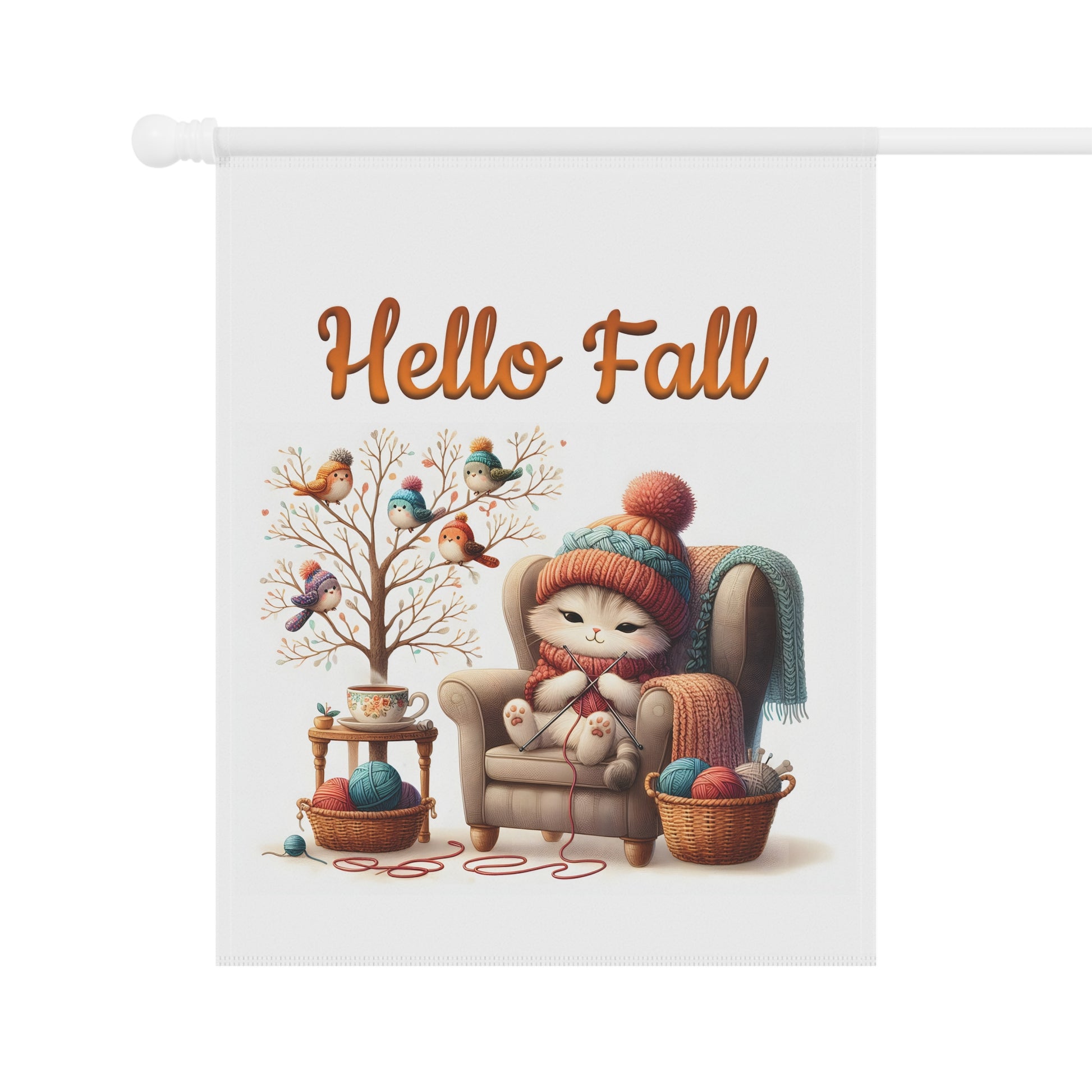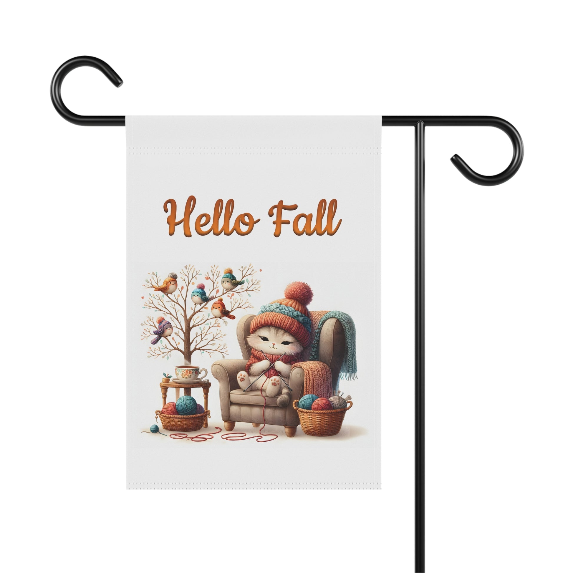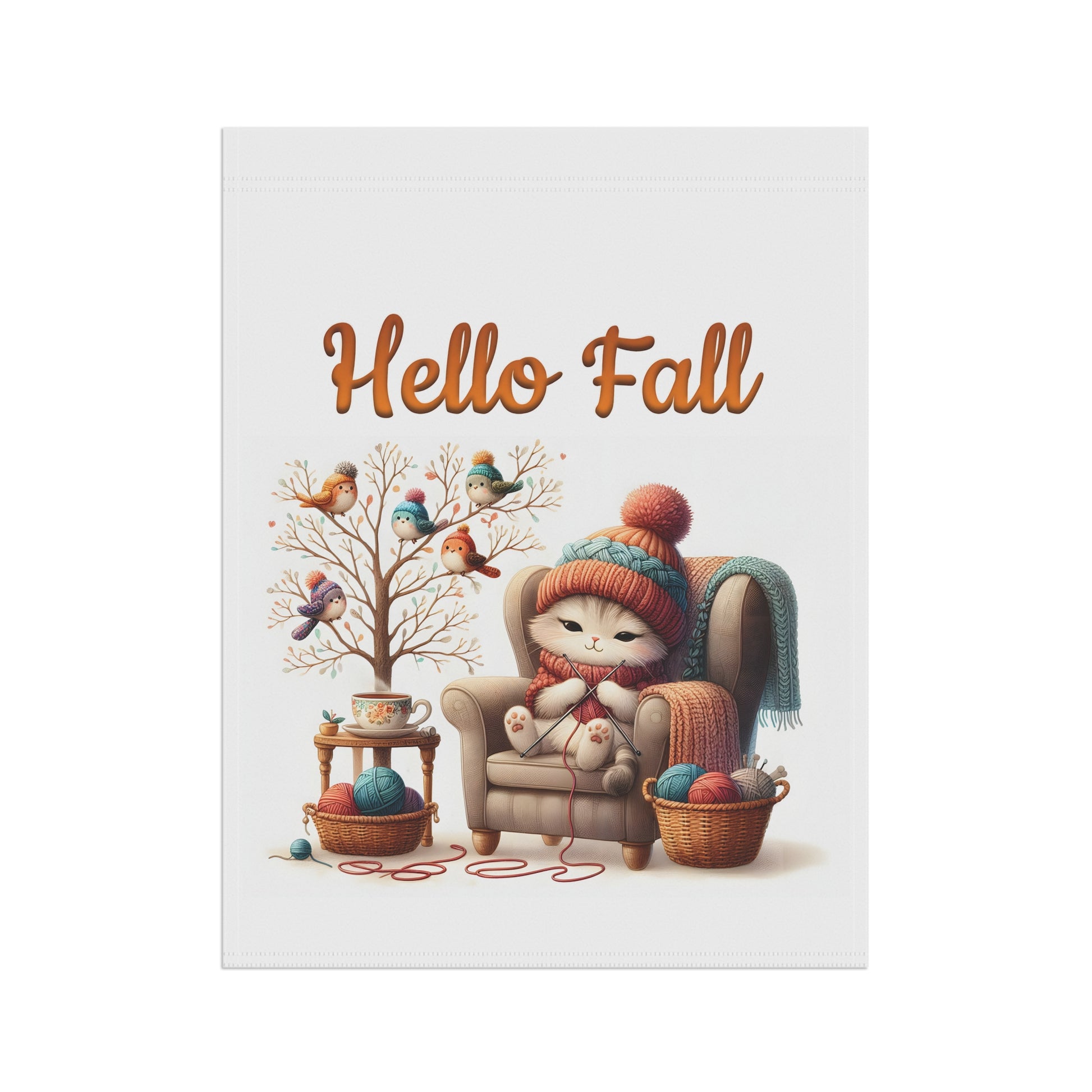 Welcome the crisp, cozy days of autumn with this adorable "Hello Fall" garden flag. This charming flag features a whimsical illustration of a cat dressed in a warm hat and scarf, comfortably knitting in an armchair. A small tree with birds and a basket of yarn complete the heartwarming scene, capturing the peaceful essence of the season. The design is printed on both sides, ensuring it looks beautiful from any angle. It fits most standard garden flag stands and is the perfect way to add a touch of personality and seasonal charm to your yard, patio, or porch.