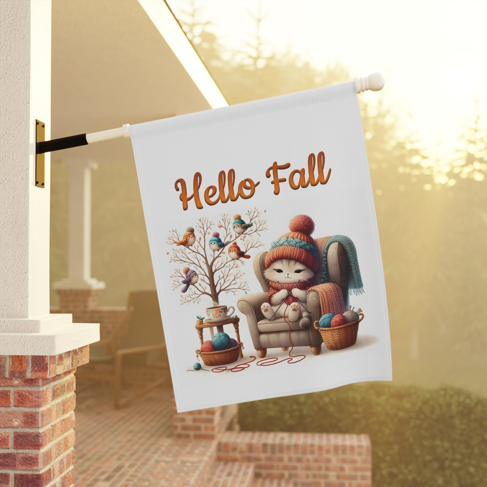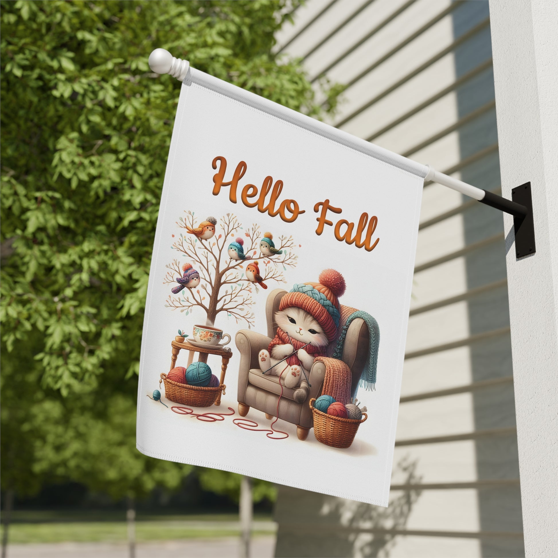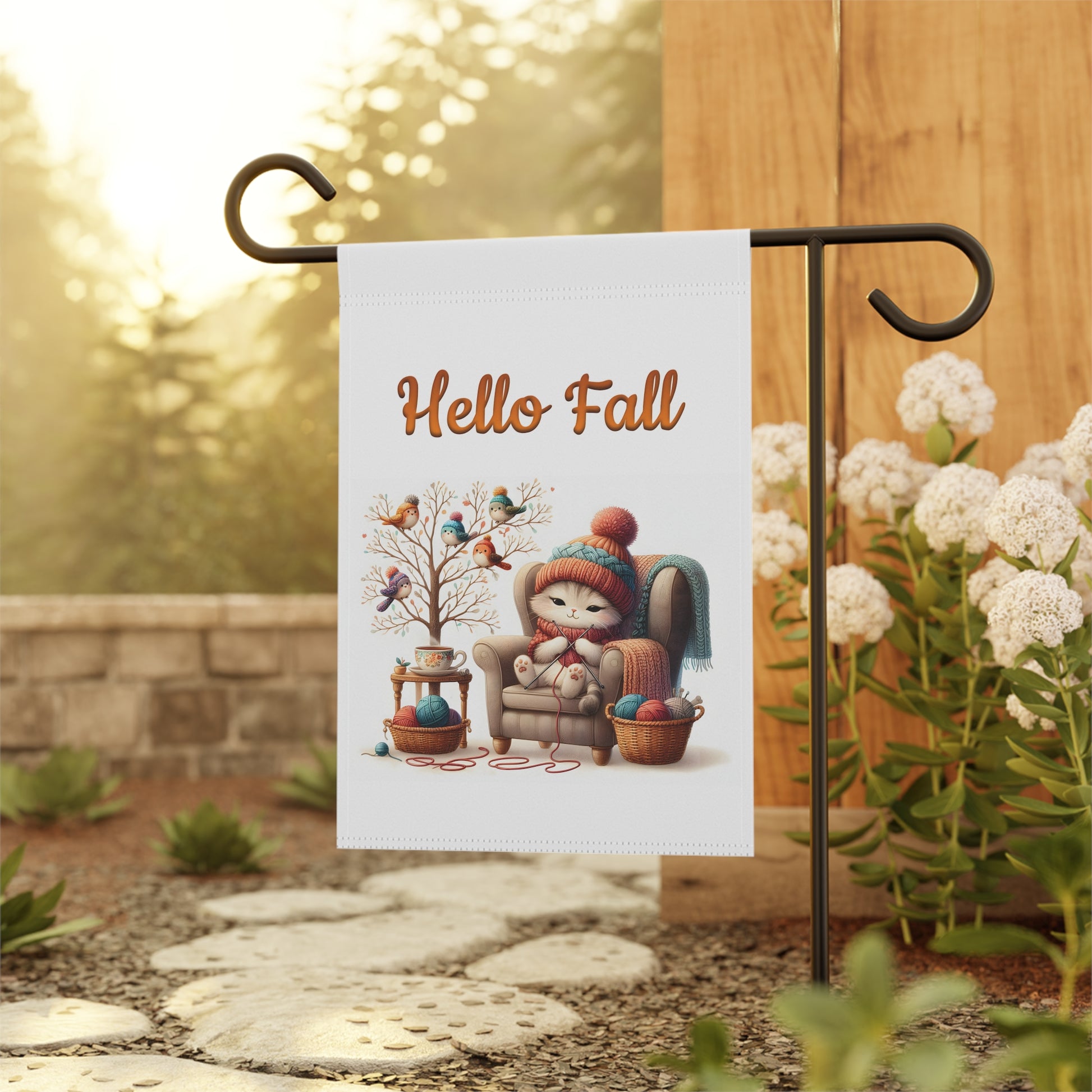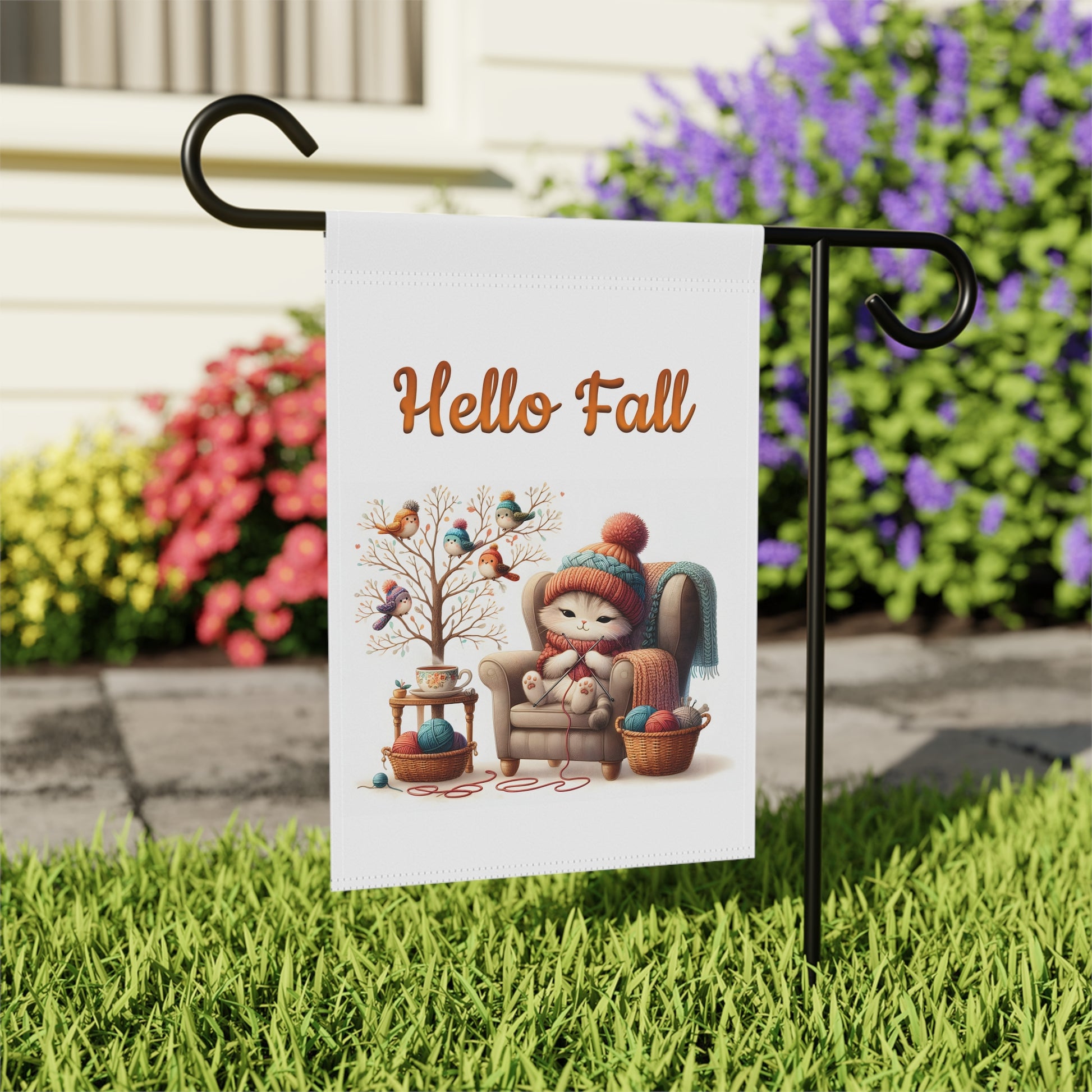 Welcome the crisp, cozy days of autumn with this adorable "Hello Fall" garden flag. This charming flag features a whimsical illustration of a cat dressed in a warm hat and scarf, comfortably knitting in an armchair. A small tree with birds and a basket of yarn complete the heartwarming scene, capturing the peaceful essence of the season. The design is printed on both sides, ensuring it looks beautiful from any angle. It fits most standard garden flag stands and is the perfect way to add a touch of personality and seasonal charm to your yard, patio, or porch.