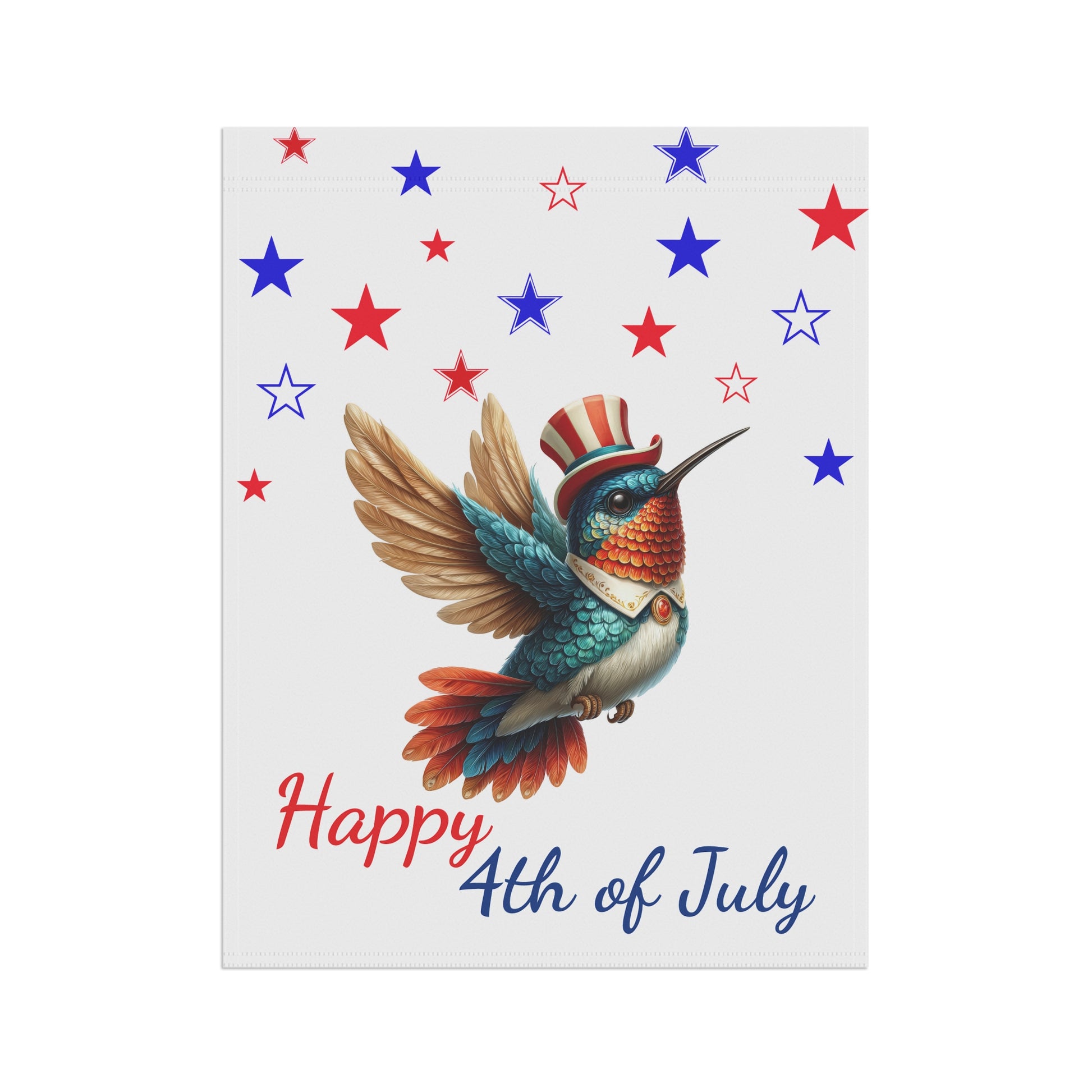 Add a unique and vibrant touch to your summer celebrations with this charming "Happy 4th of July" garden flag! It features a beautiful hummingbird adorned with a patriotic top hat and surrounded by scattered red and blue stars, capturing the spirit of independence with a delightful twist. Perfect for celebrating the 4th of July, Memorial Day, Flag Day, or simply for adding a touch of patriotic flair to your garden, yard, patio, or entryway throughout the summer season. Crafted from durable, weather-resistant material, this flag is designed to withstand the elements and maintain its brilliant colors, ensuring it looks stunning under the summer sun. A wonderful addition to your holiday decor or a thoughtful gift for bird lovers and patriots alike. Double-sided print ensures the festive design is visible from all angles.