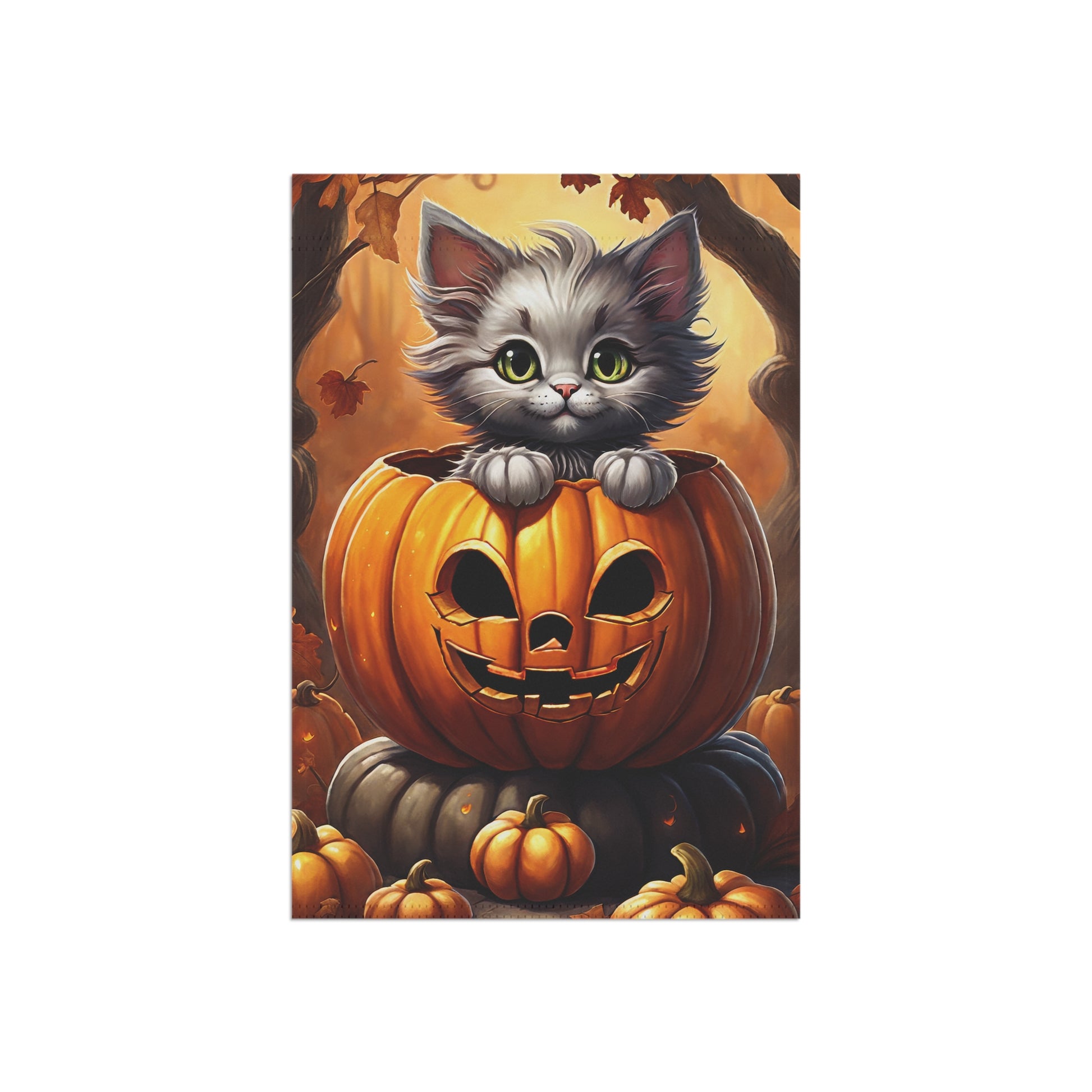 Bring charm to your Halloween decor with our adorable garden flag featuring a fluffy gray kitten peeking out of a carved jack-o'-lantern. Surrounded by pumpkins and autumn leaves, this delightful flag captures the magic of fall with a playful twist. A perfect way to welcome guests with spooky-cute vibes!