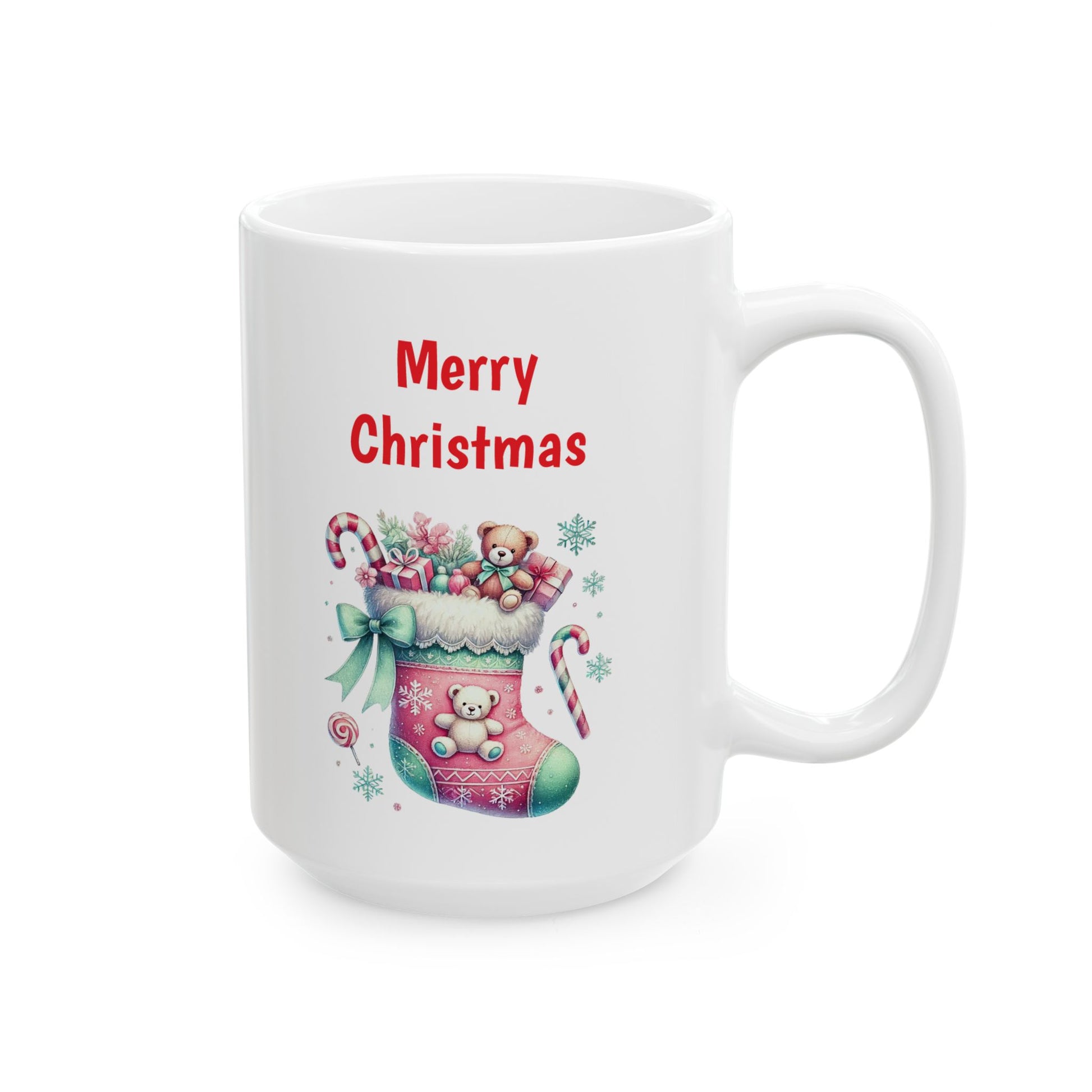 Get into the holiday spirit with our delightful "Merry Christmas" coffee mug! This charming mug features a beautifully illustrated Christmas stocking overflowing with classic holiday treats and toys, including candy canes, gifts, and an adorable teddy bear. It's the perfect way to enjoy your favorite hot beverages throughout the festive season and makes a wonderful gift for anyone who loves the magic of Christmas morning. Crafted from durable white ceramic, this mug is both microwave and dishwasher safe for your convenience. Bring the joy of the holidays to your home or office with this enchanting and unique mug!