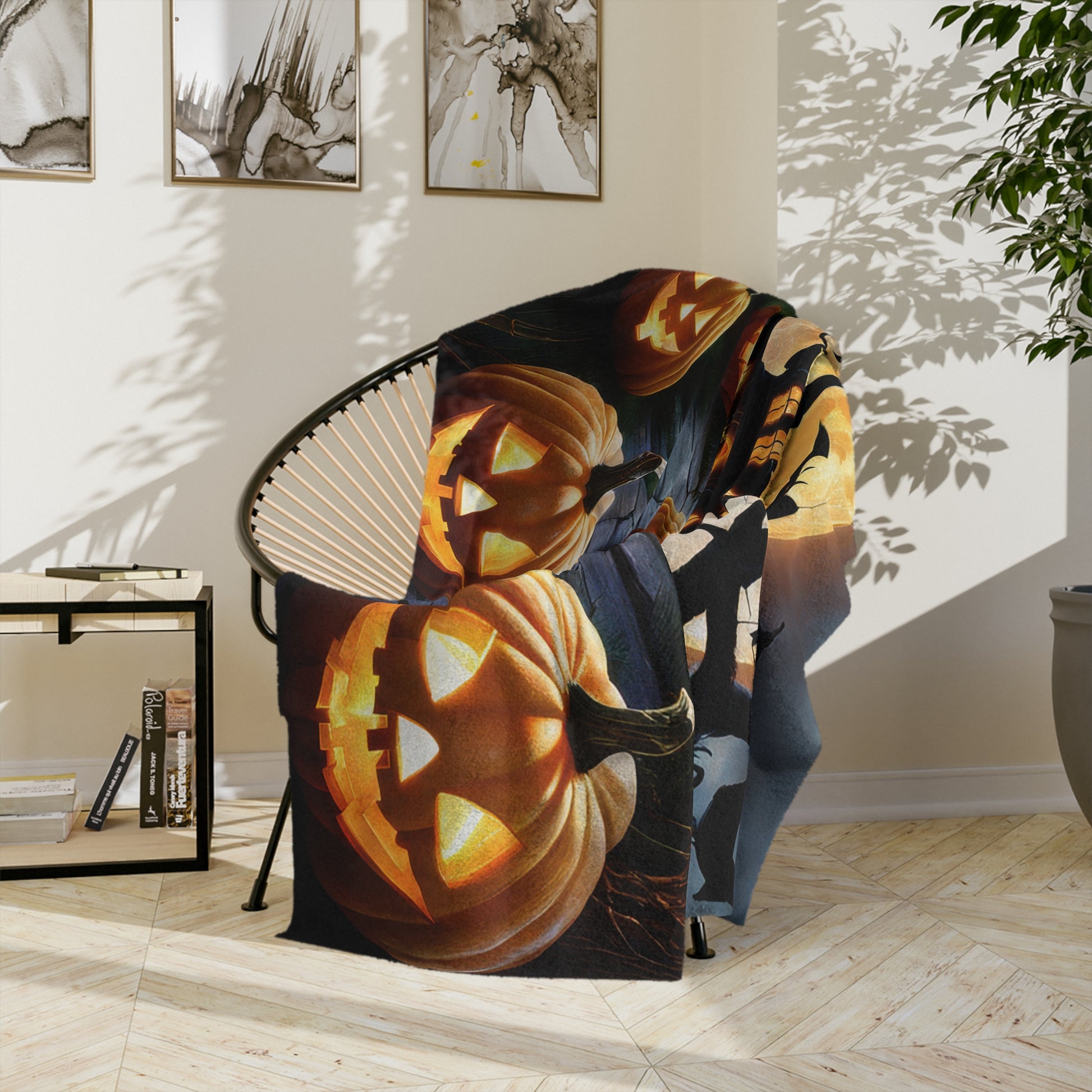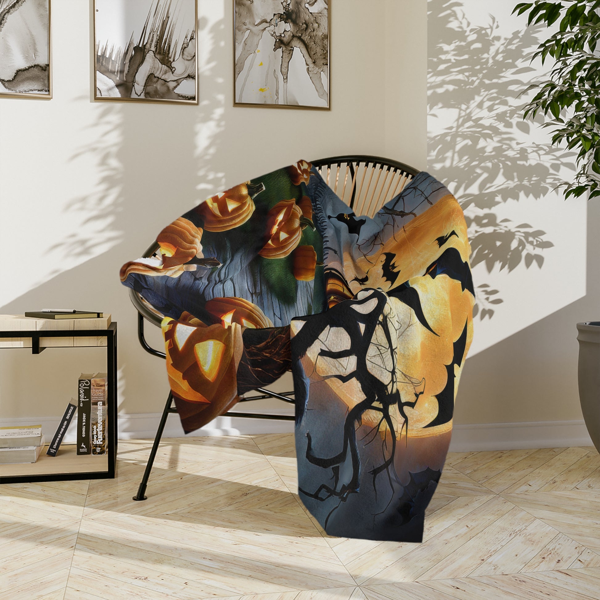 Immerse yourself in the enchanting mystery of Halloween with our Mystical Haunted Mansion Plush Blanket! This soft and luxurious throw blanket features a captivating design of a classic haunted mansion with its windows aglow, silhouetted against a magnificent, fiery orange full moon. A winding path lit by an array of smiling jack-o'-lanterns leads up to the eerie estate, while silhouetted bats soar through the dark, gnarled trees. Perfect for creating a spooky yet cozy atmosphere, this blanket is an essential addition to your Halloween decorations. Whether draped over a sofa, used as a bed accent, or for snuggling up during frightful films, its plush comfort and vivid imagery will enhance your seasonal experience. Crafted from high-quality, lightweight fabric, it's both wonderfully soft and comfortably warm.