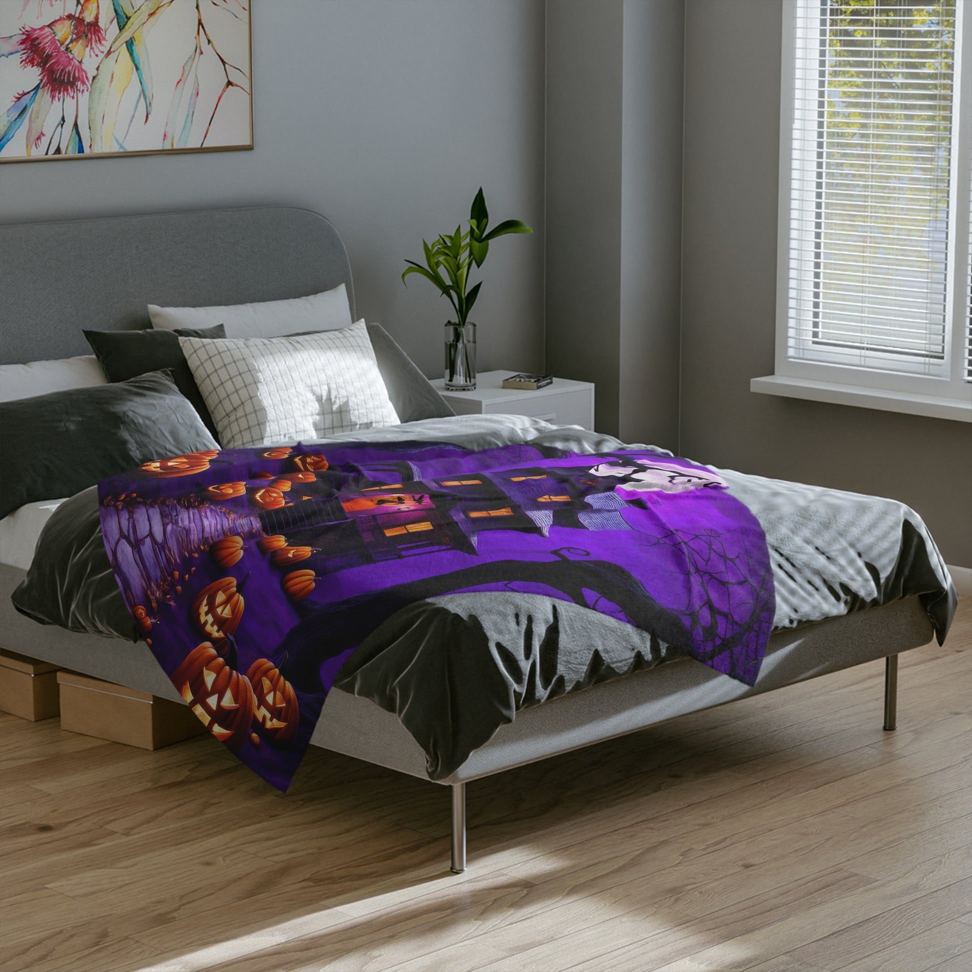 Mystical Purple Haunted House & Pumpkin Path Lightweight Velveteen Blanket
