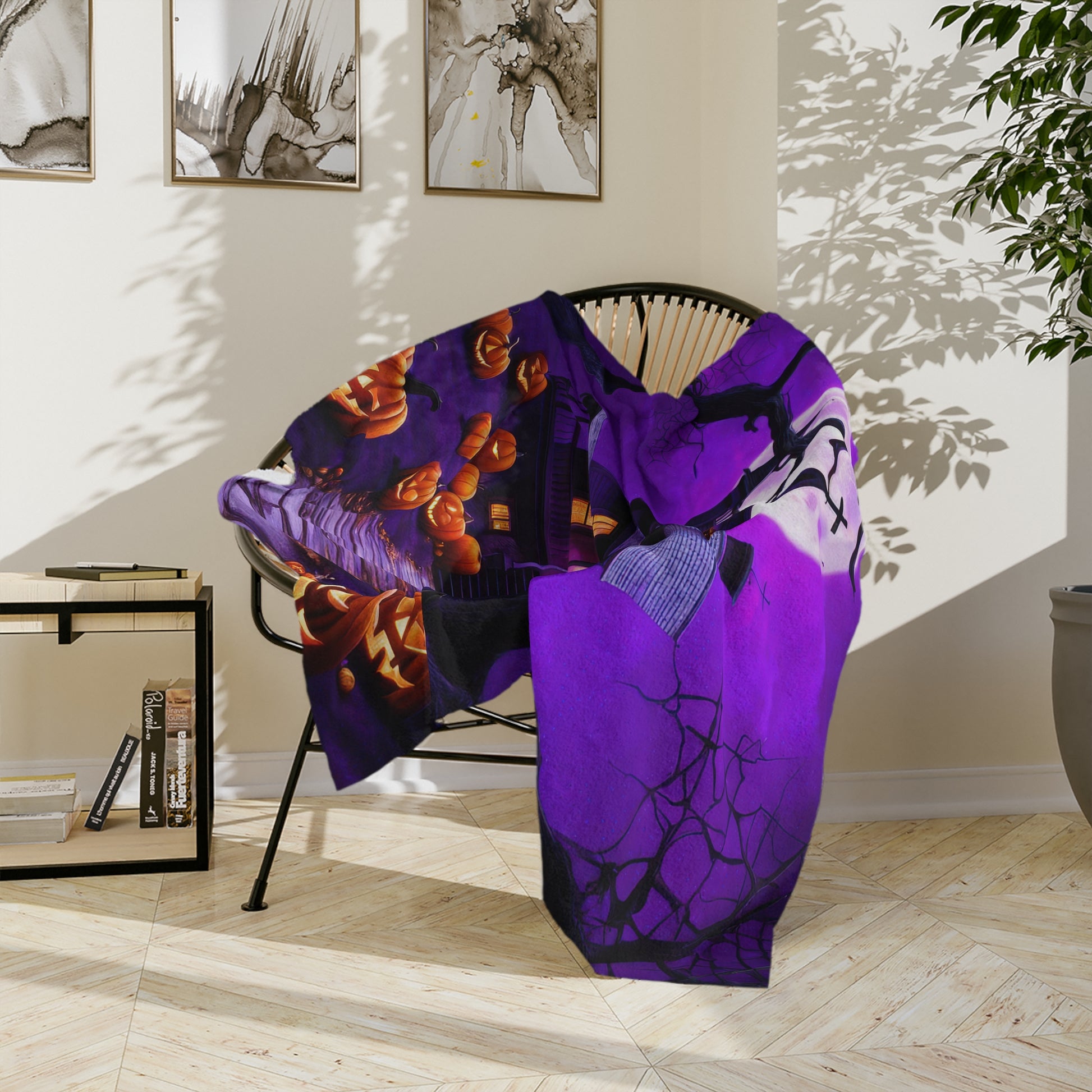 Step into an enchanted Halloween night with our captivating lightweight velveteen blanket! This spellbinding design features a majestic haunted house with glowing windows and a silhouetted tree, all under a vast, luminous purple full moon. A winding path of glowing jack-o'-lanterns leads to the front door, inviting you into the mystery of the season. Perfect for cozying up during spooky movie marathons, adding a vibrant and eerie focal point to your home decor, or setting the perfect ambiance for your Halloween gatherings. Made from luxuriously soft and lightweight velveteen fabric, it offers gentle warmth and exceptional comfort. A must-have for Halloween enthusiasts who love bold colors and mystical themes!