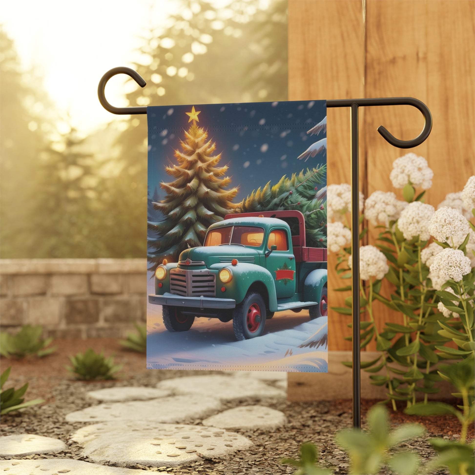 Bring nostalgic charm to your holiday decor with our vintage truck carrying a Christmas tree garden flag! This classic design features an old-fashioned pickup laden with a fresh-cut tree, perfect for adding rustic warmth and festive cheer to your outdoor space this season.