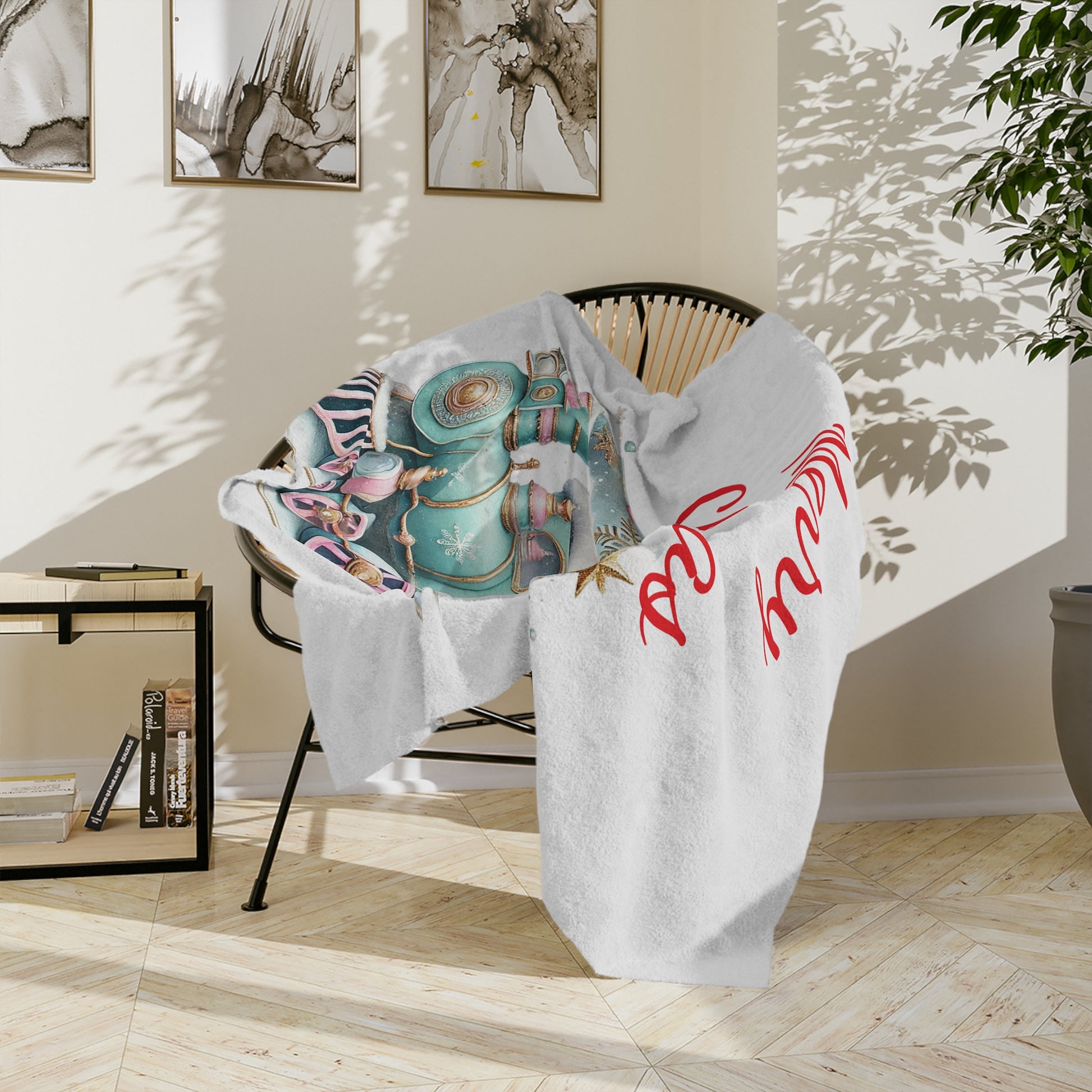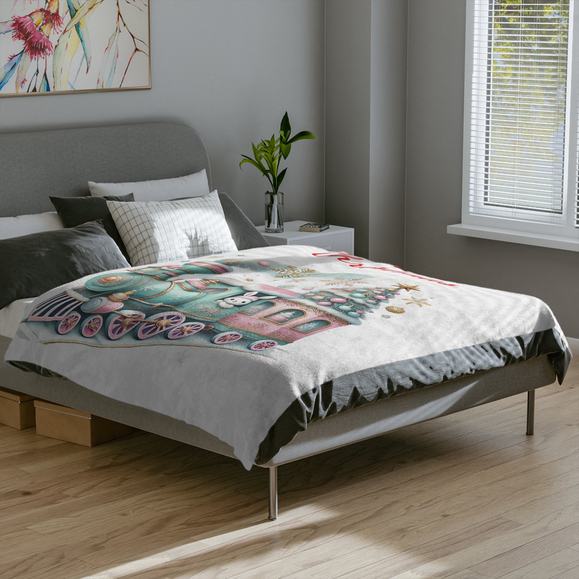 Bring the magic of the season home with this pastel Christmas train blanket, featuring a whimsical turquoise and pink steam engine, a decorated Christmas tree, and an adorable bunny conductor. The dreamy snowflakes, “Merry Christmas” greeting, and festive colors make this blanket a charming holiday accent for any room. This soft and cozy throw is perfect for kids, pastel lovers, and winter décor enthusiasts. Whether on a couch or at the foot of a bed, it adds instant cheer to your holiday setup.