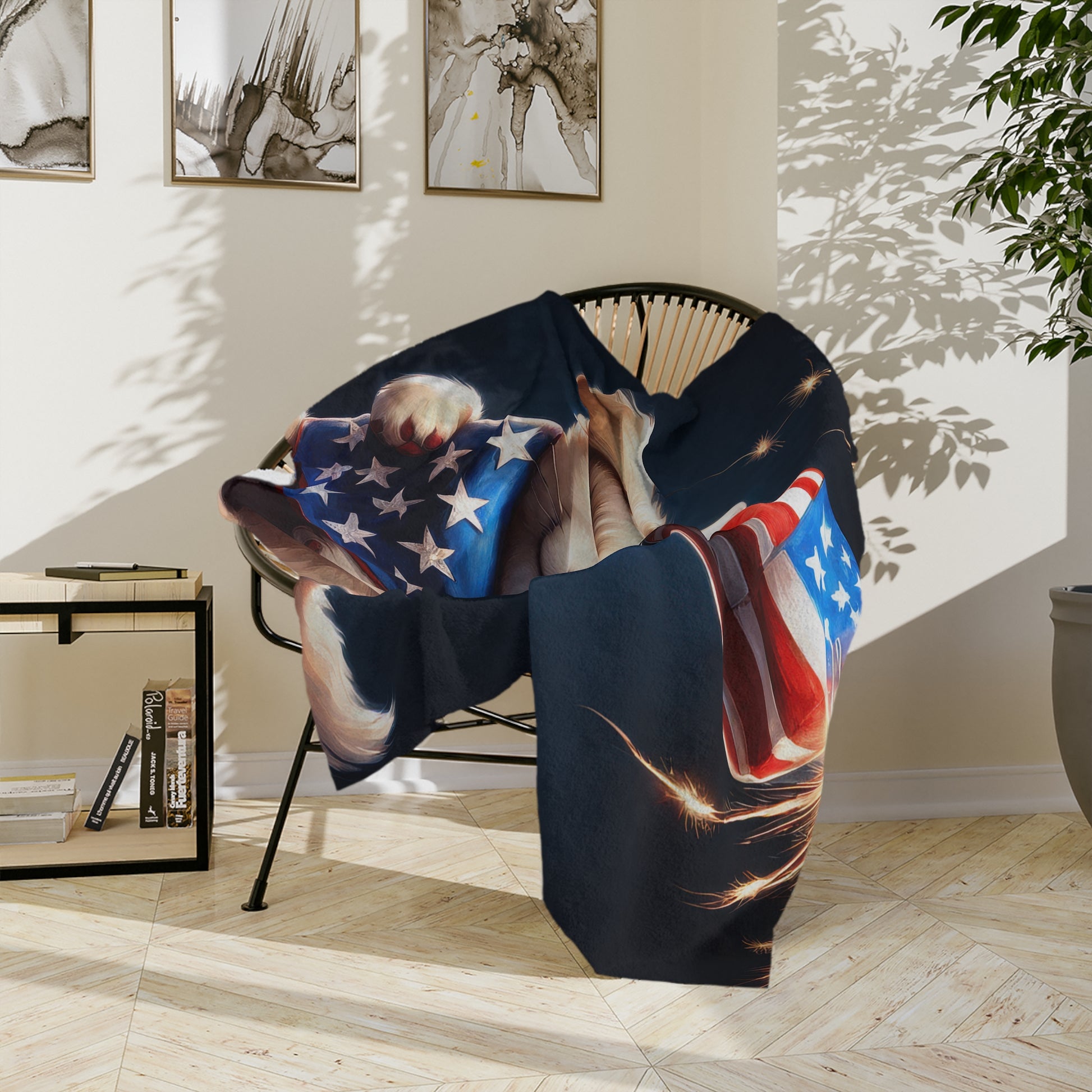 Snuggle up with stars, stripes, and puppy love! This ultra-soft Patriotic Puppy Plush Blanket features an irresistibly cute dog wearing a red, white, and blue top hat and star-spangled bandana. With fireworks sparkling in the background, this design brings the perfect mix of warmth, celebration, and charm to your 4th of July festivities or Americana-themed home. Ideal for cozy nights watching fireworks, decorating your sofa for the holiday, or gifting to dog lovers and patriotic souls, this lightweight throw is sure to be a favorite year after year.