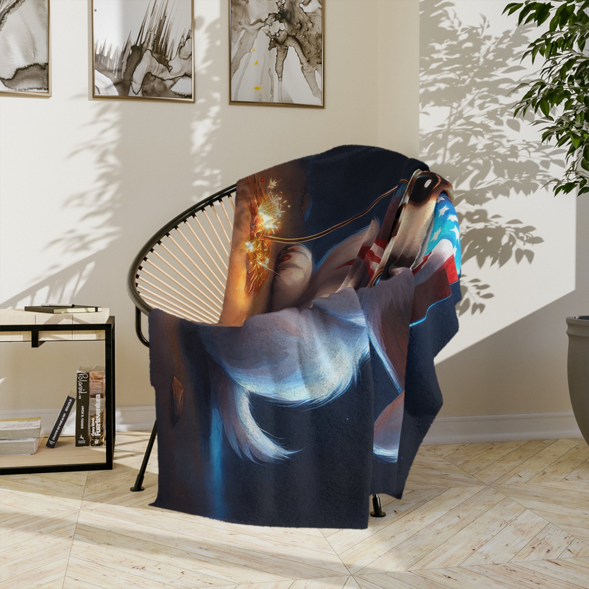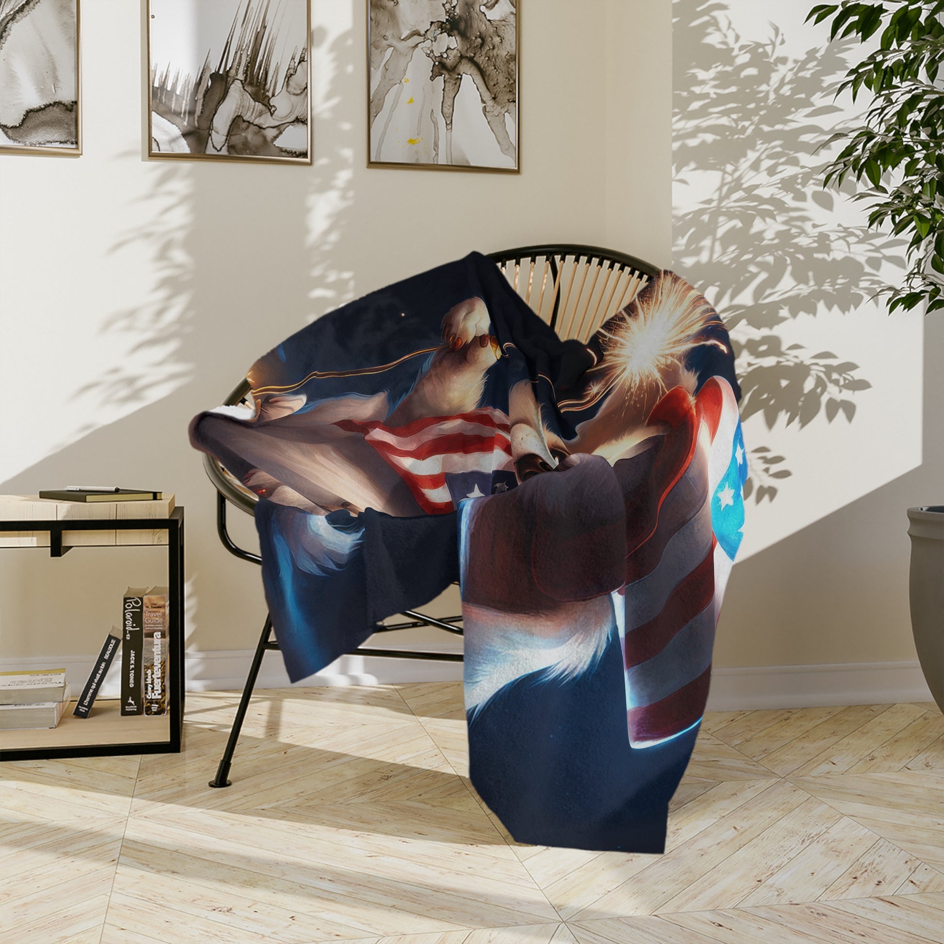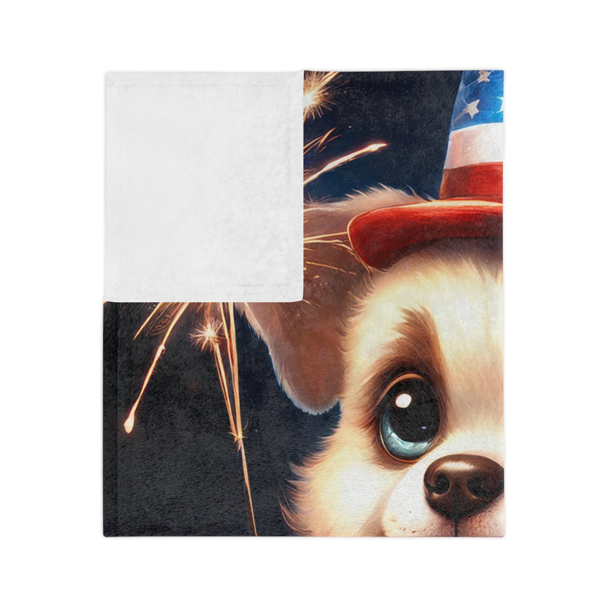 Celebrate the 4th of July with snuggles and sparkles! This Patriotic Puppy Velveteen Plush Blanket features an irresistibly cute puppy wearing a star-spangled scarf and top hat while holding a glowing sparkler. Perfect for Independence Day festivities or simply cuddling up with some patriotic flair. This plush throw delivers warmth, charm, and comfort in one adorable package. Whether you're watching fireworks or decorating for the season, this blanket adds festive joy to your space.