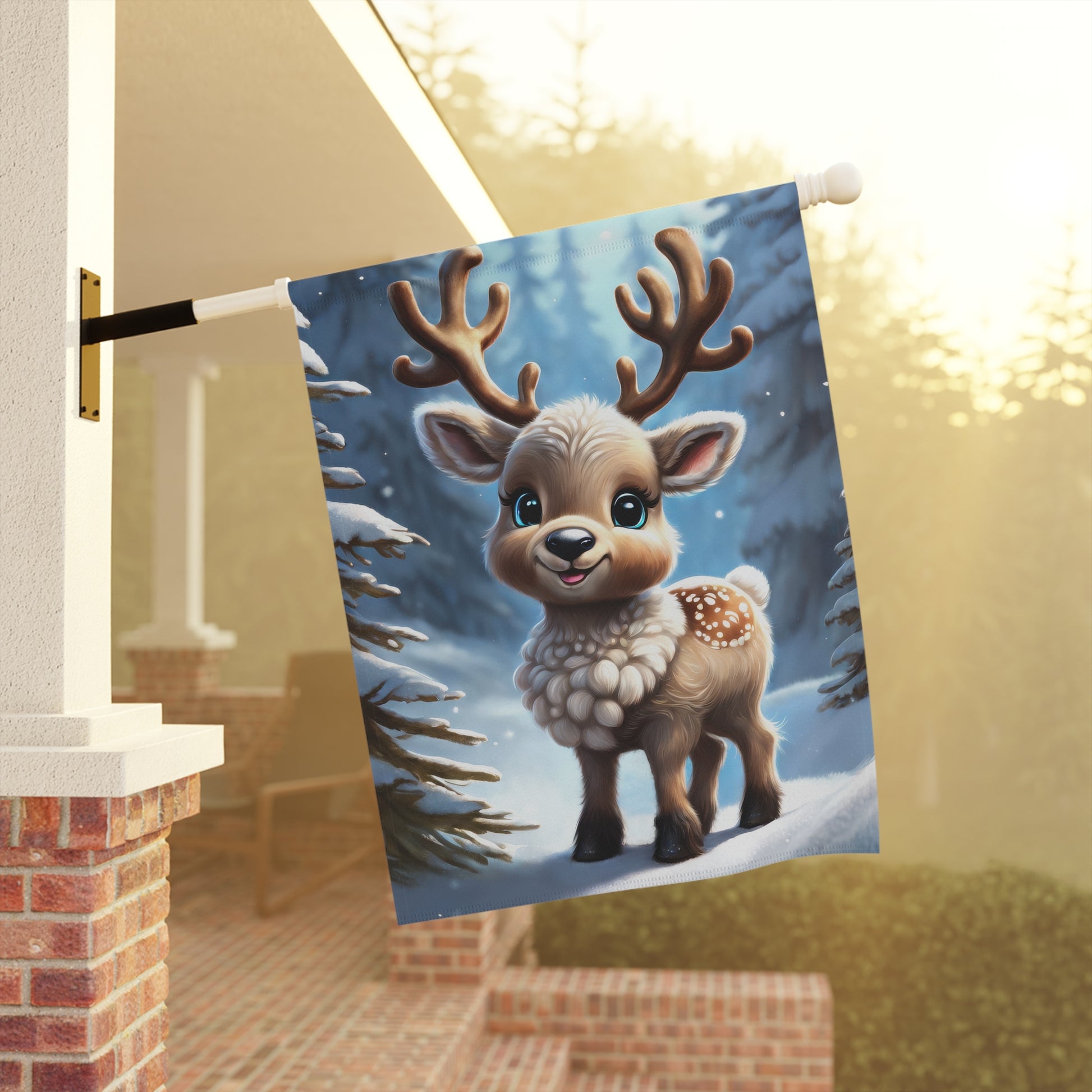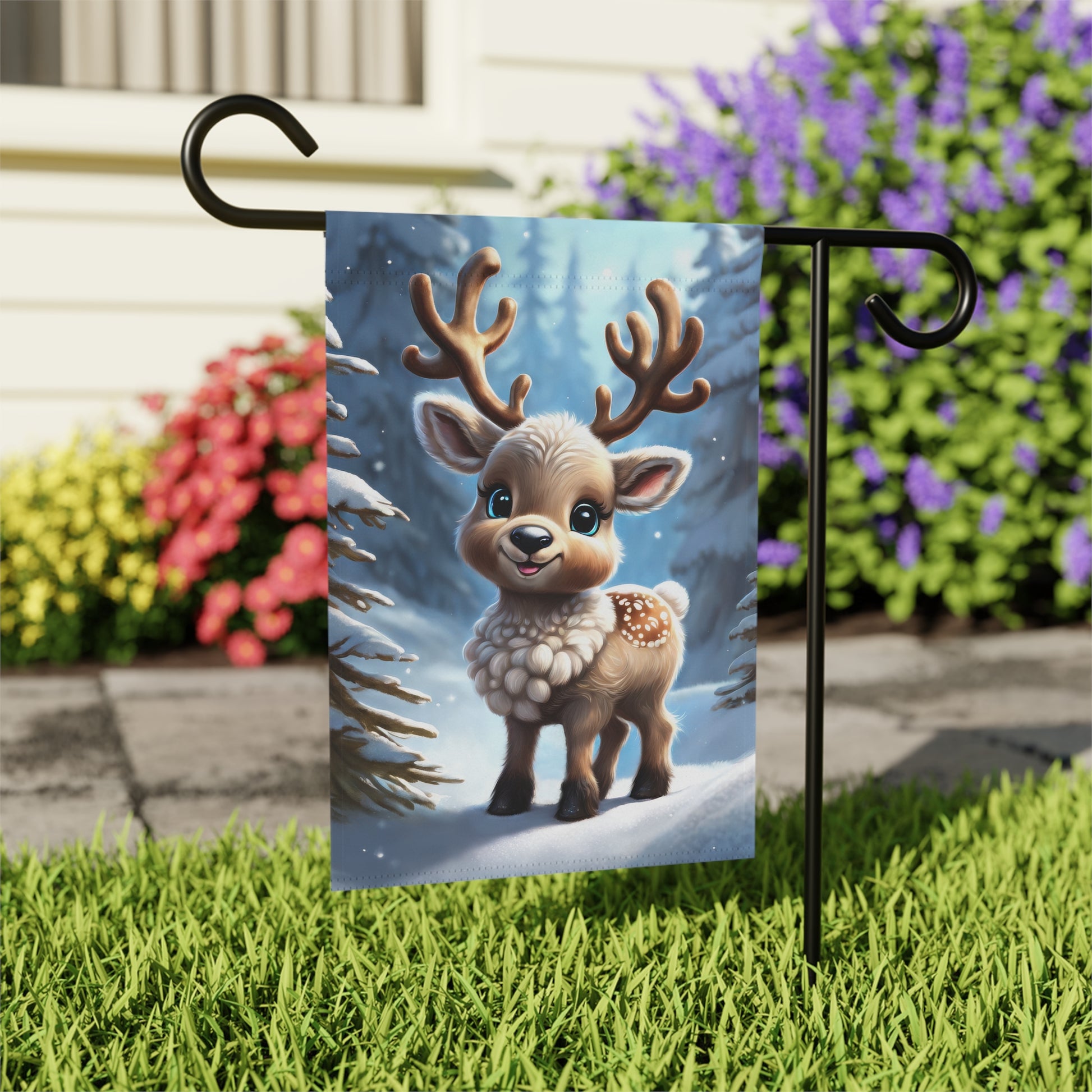 Welcome the holiday season with this irresistibly cute garden flag featuring an adorable baby reindeer with big, innocent eyes, a charming fluffy white collar, and subtle spots! Set against a serene snowy forest backdrop with gentle falling snowflakes, this delightful flag embodies the heartwarming magic of winter. It's the perfect outdoor decoration to add a touch of whimsy and festive cheer to your garden, patio, or entryway. Crafted from durable, weather-resistant material, it's designed to withstand the elements and maintain its vibrant colors year after year. A wonderful way to spread holiday spirit or a thoughtful gift for reindeer and Christmas enthusiasts!