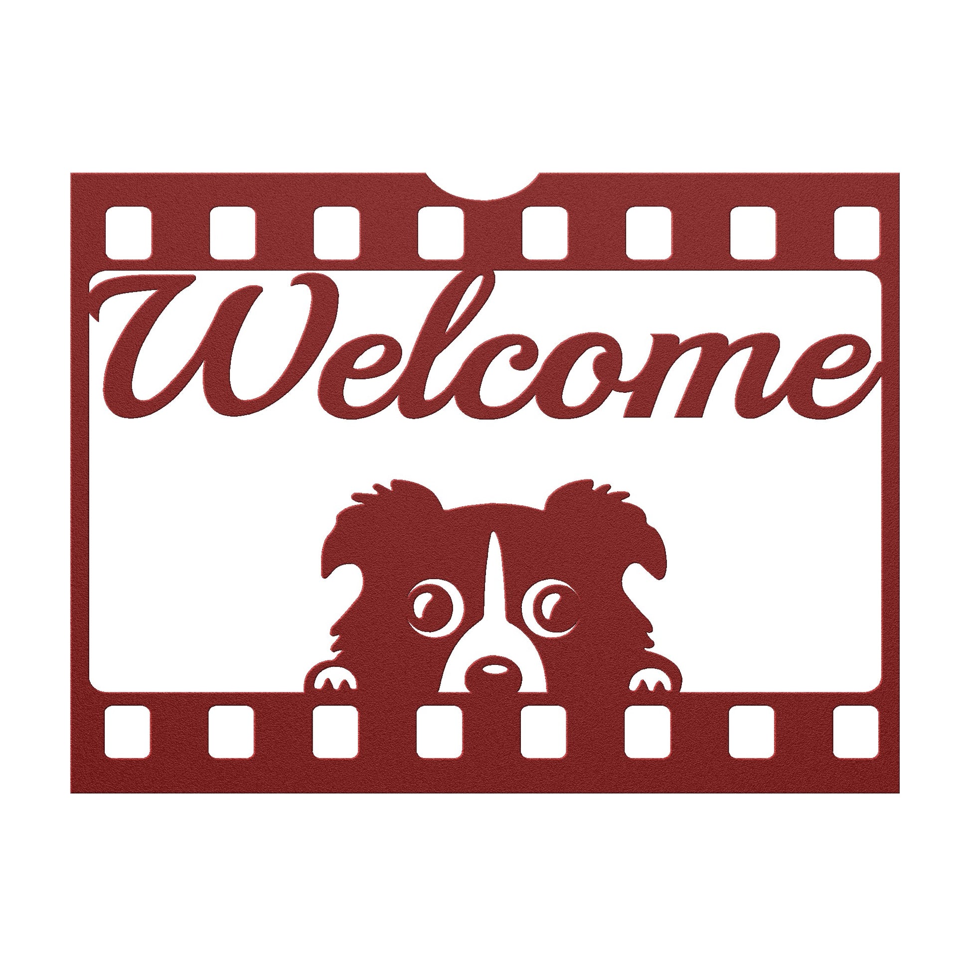 Welcome guests with a wagging tail and a smile! Our adorable Puppy Welcome Metal Sign is the perfect addition to any dog lover's home. Made from durable 18-gauge steel, this sign features a playful puppy peeking out from a unique movie film frame design, with the word "Welcome" elegantly scripted above.