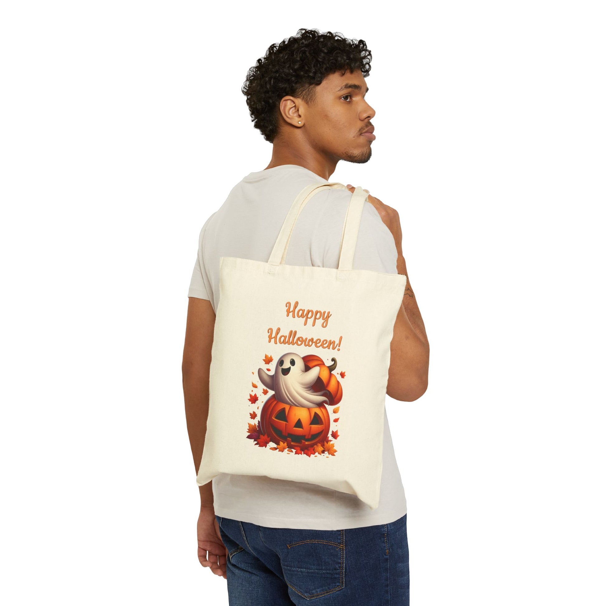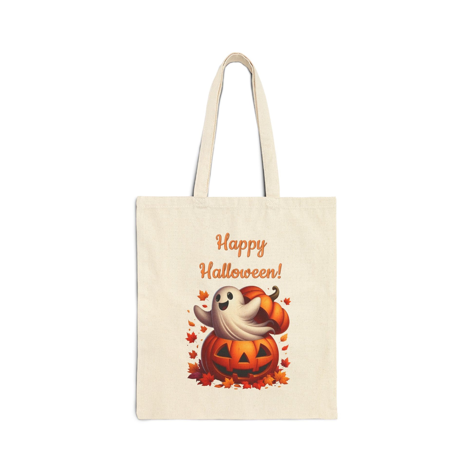 Get into the Halloween spirit with our "Happy Halloween!" canvas tote bag. This super cute and charming design features a friendly little ghost popping out of a carved jack-o'-lantern, surrounded by autumn leaves. It’s the perfect, eco-friendly accessory for all your fall and spooky season adventures.