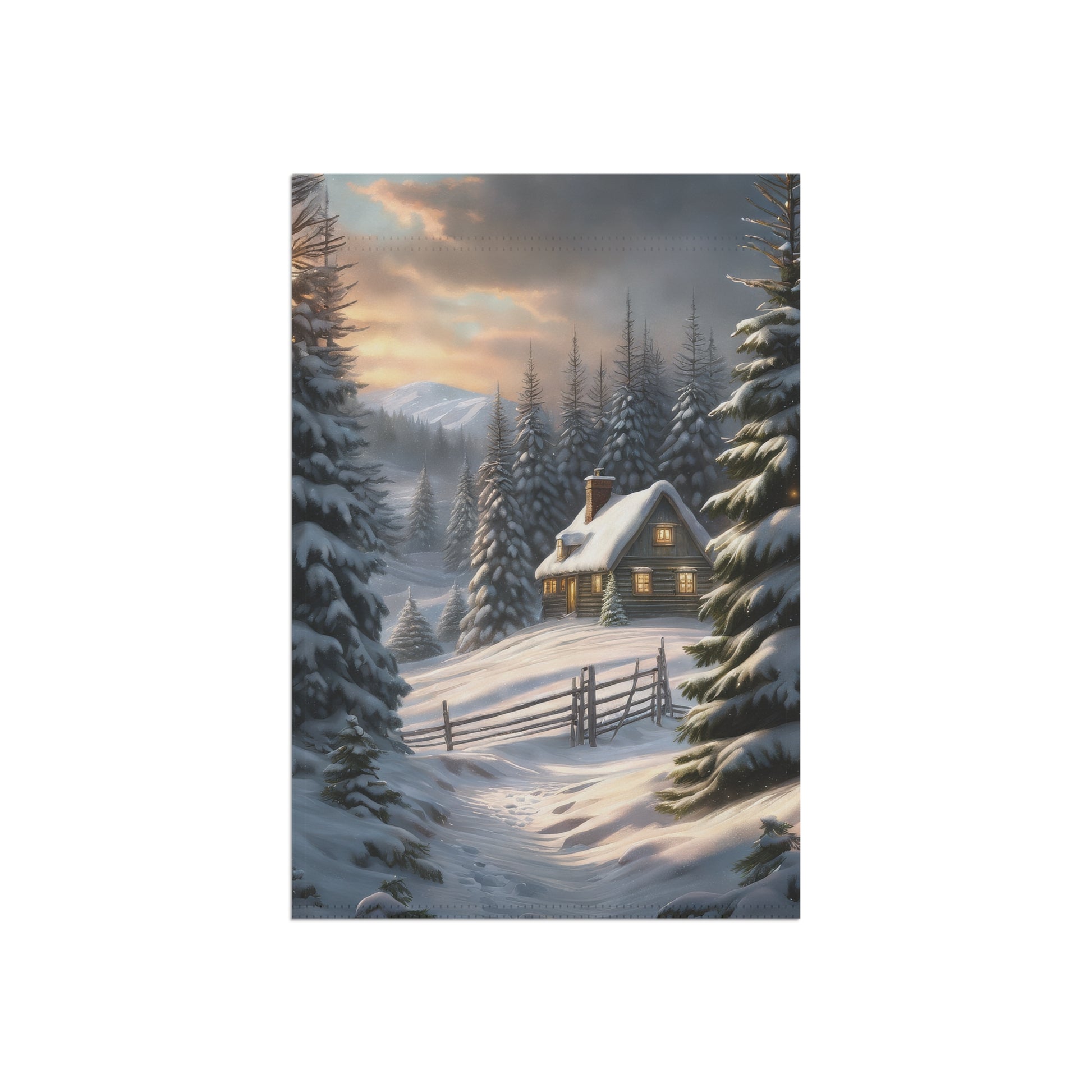 Evoke the serene beauty of a peaceful winter retreat with this charming garden flag. It features a cozy, snow-covered log cabin nestled among frosted evergreen trees, with a rustic wooden fence and a winding snowy path leading through the tranquil landscape under a soft, twilight sky. This flag captures the idyllic charm of a winter wonderland, perfect for creating a welcoming and calm atmosphere. Crafted from durable, weather-resistant material, it's designed to withstand the elements and maintain its vibrant colors throughout the cold season. Perfect for adding a rustic yet elegant touch to your garden, patio, or entryway during winter and the holidays.