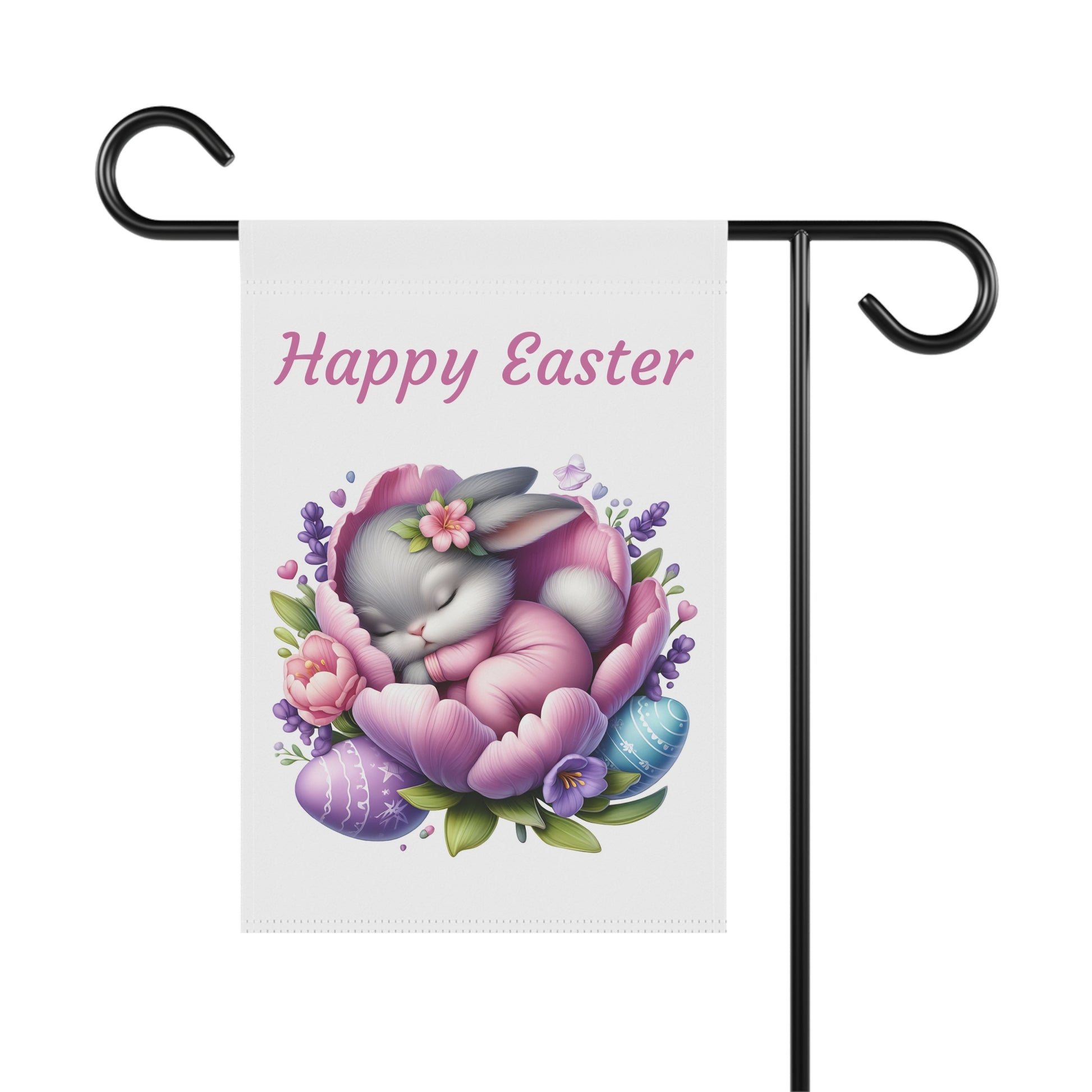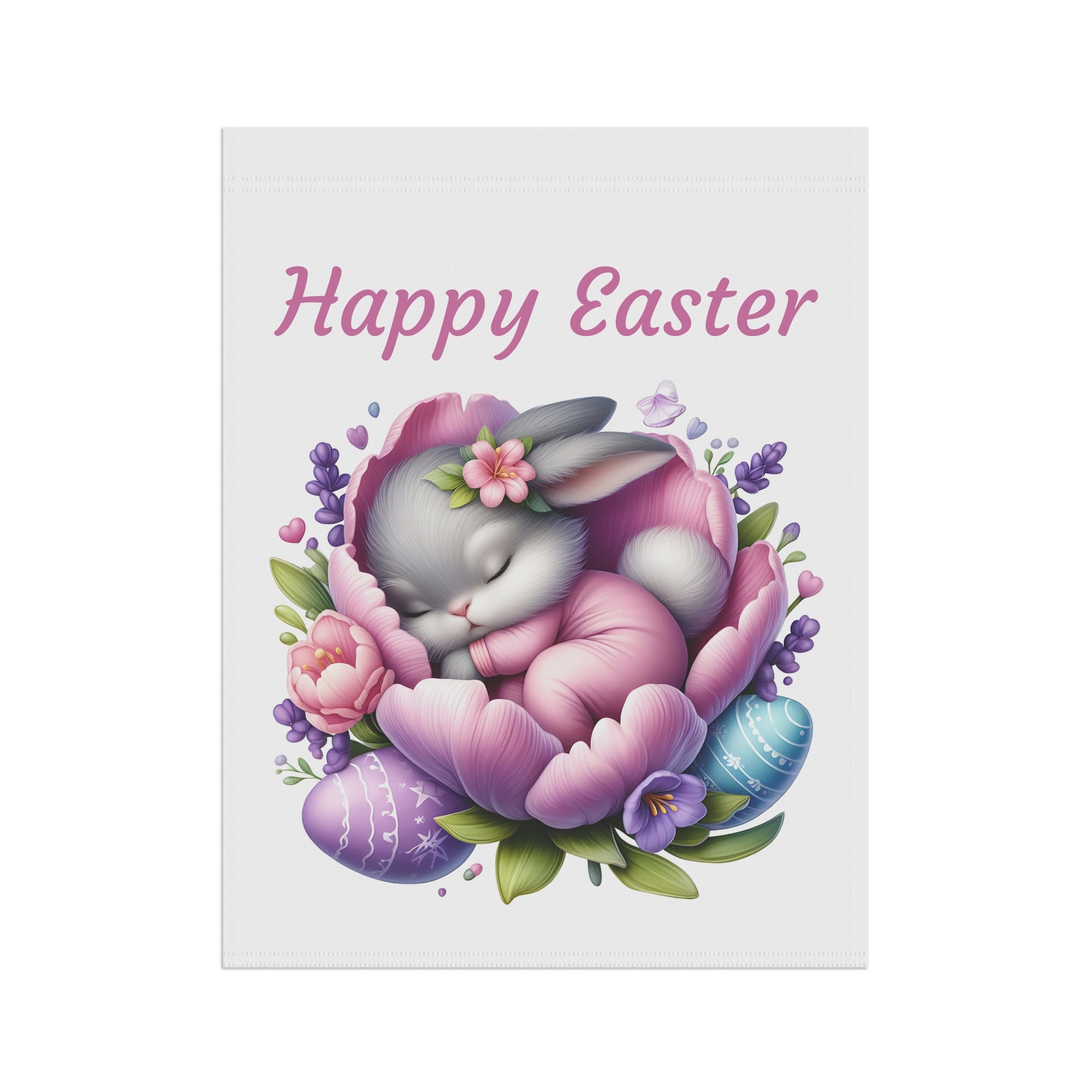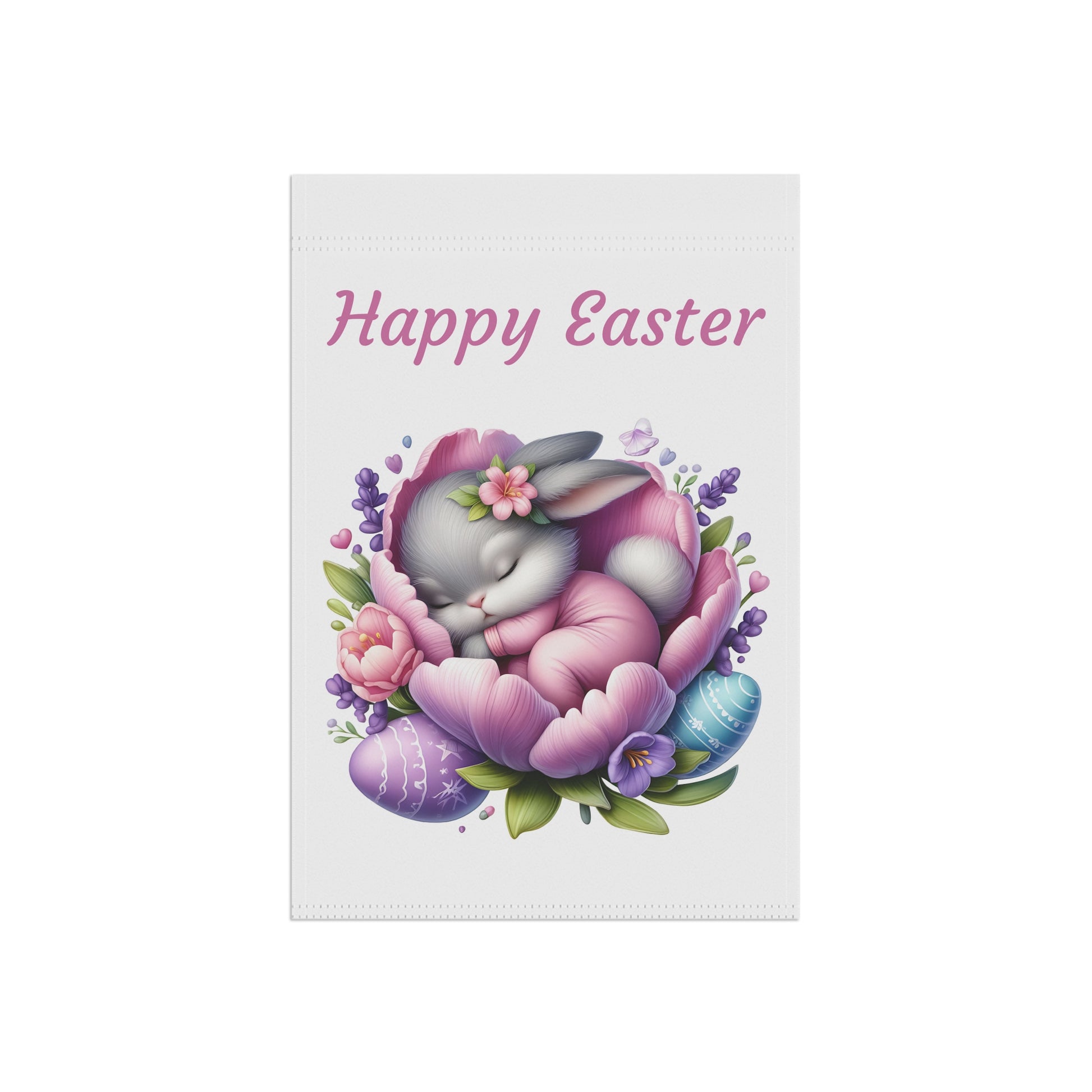 Bring a serene and utterly adorable touch to your outdoor space this Easter with our "Happy Easter Sleeping Bunny" Garden Flag! This heartwarming flag features a sweet little gray bunny peacefully nestled asleep in the soft petals of a beautiful purple and pink flower, surrounded by delicate lavender sprigs and colorful Easter eggs. The gentle "Happy Easter" message floats above, creating a calm and welcoming atmosphere for your garden, yard, or patio. Crafted from high-quality, weather-resistant material, this durable flag is designed to withstand the elements, ensuring its vibrant colors and charming scene remain bright and beautiful throughout the spring season.