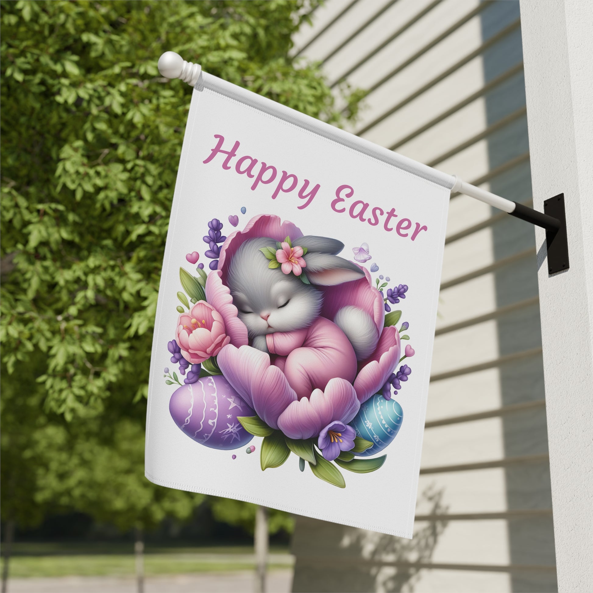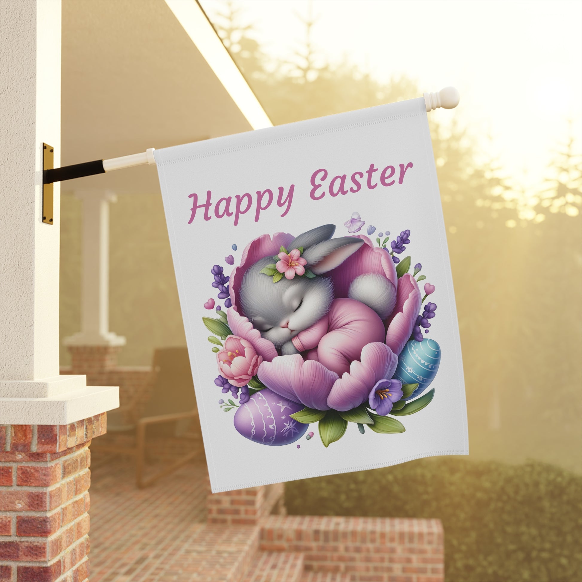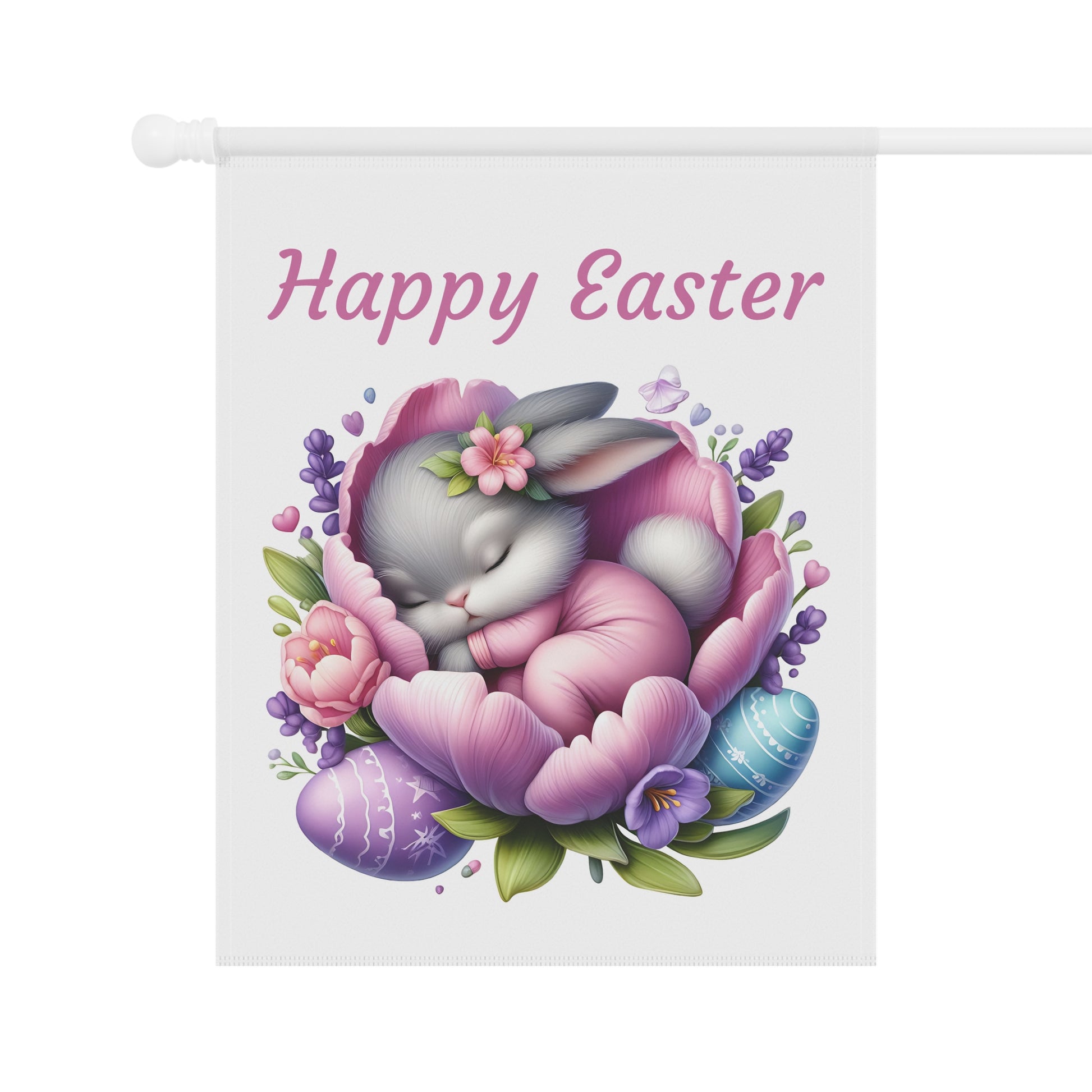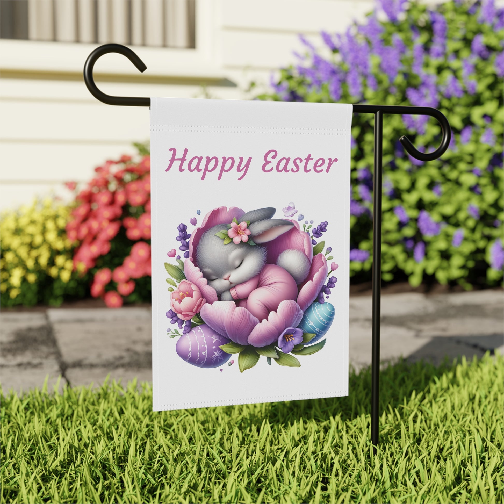 Bring a serene and utterly adorable touch to your outdoor space this Easter with our "Happy Easter Sleeping Bunny" Garden Flag! This heartwarming flag features a sweet little gray bunny peacefully nestled asleep in the soft petals of a beautiful purple and pink flower, surrounded by delicate lavender sprigs and colorful Easter eggs. The gentle "Happy Easter" message floats above, creating a calm and welcoming atmosphere for your garden, yard, or patio. Crafted from high-quality, weather-resistant material, this durable flag is designed to withstand the elements, ensuring its vibrant colors and charming scene remain bright and beautiful throughout the spring season.