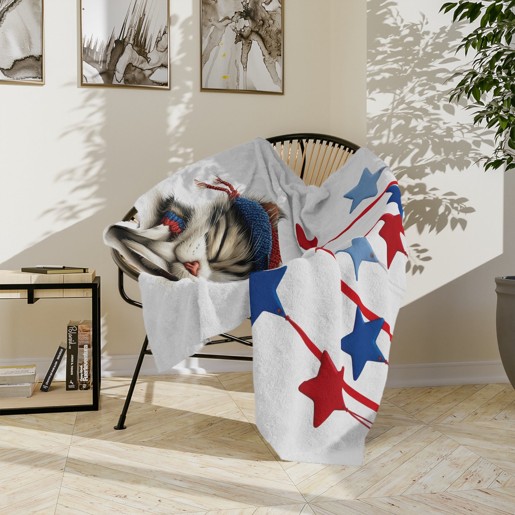 Celebrate Independence Day with cozy charm! This Velveteen Plush Blanket features an irresistibly cute sleeping kitten dressed in a red, white, and blue knit hat with matching mittens. Above, red and blue stars dangle playfully, adding a festive Americana flair. Soft, warm, and adorable, this blanket is perfect for cat lovers, patriotic décor enthusiasts, or anyone looking to add a snuggly touch of 4th of July spirit to their space. Ideal for bedrooms, couches, or as a thoughtful gift!