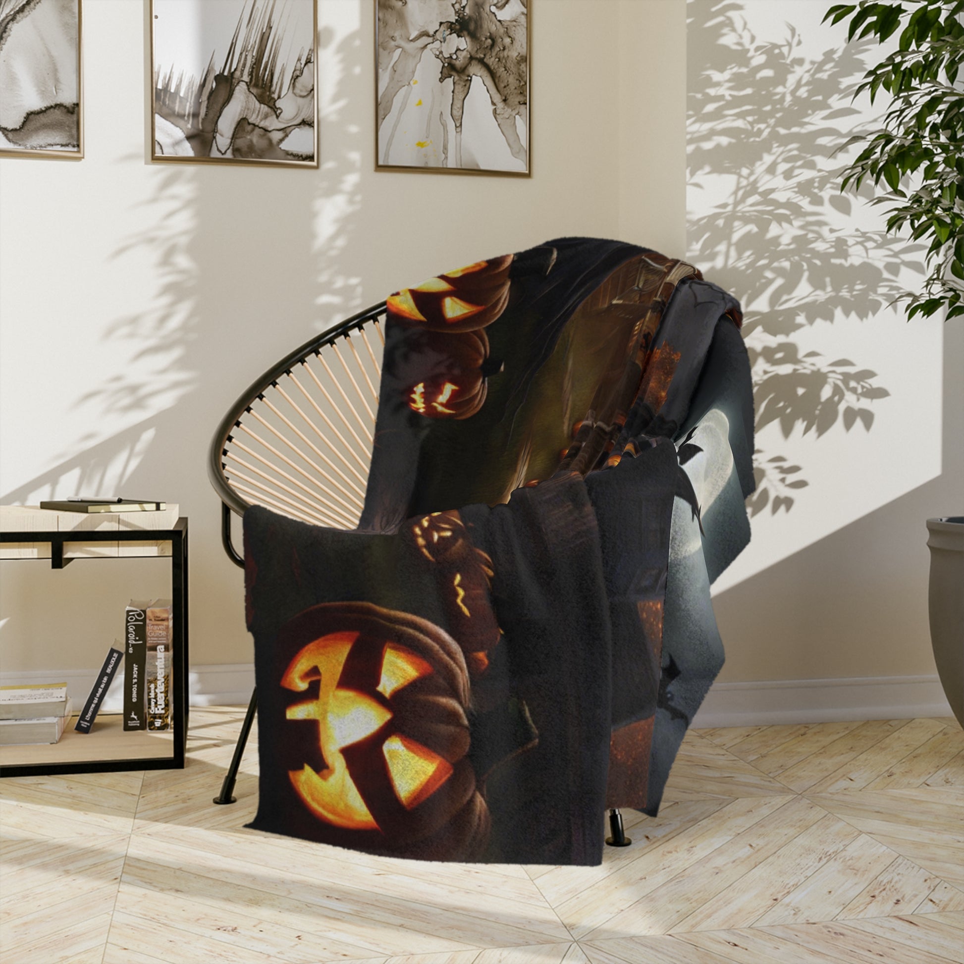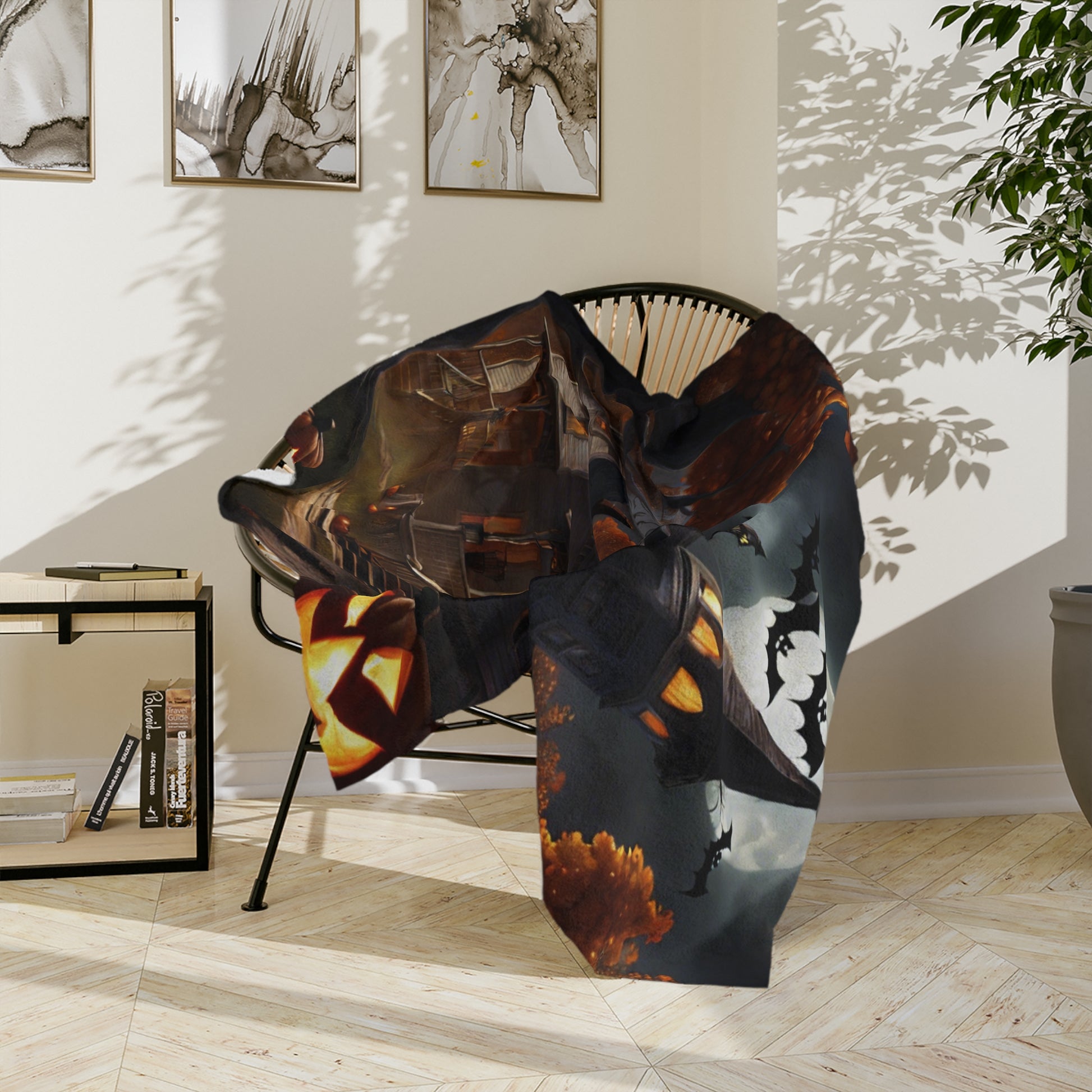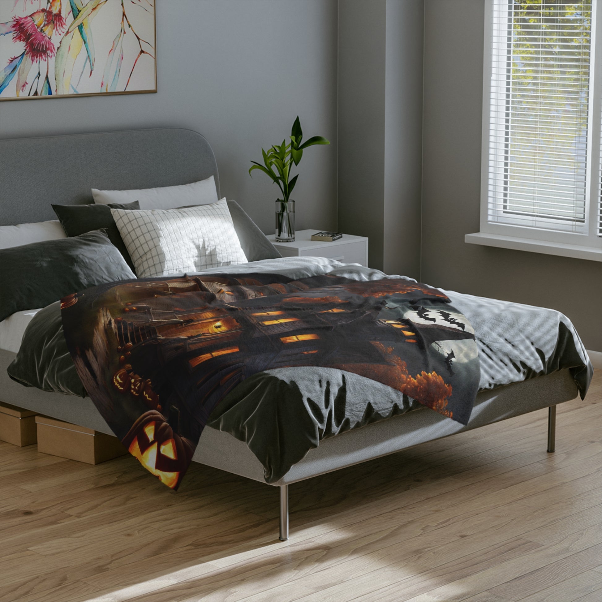 Spooky Cottage & Glowing Pumpkins Halloween Lightweight Velveteen Blanket