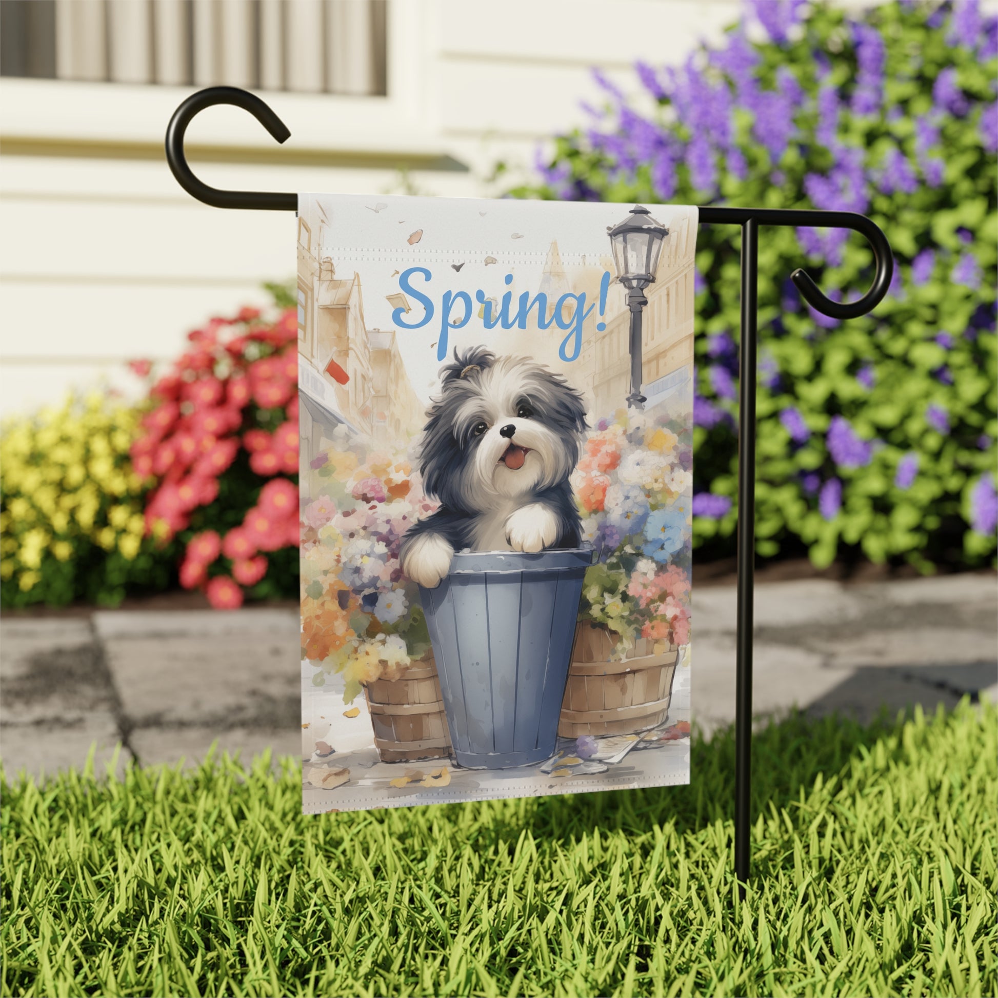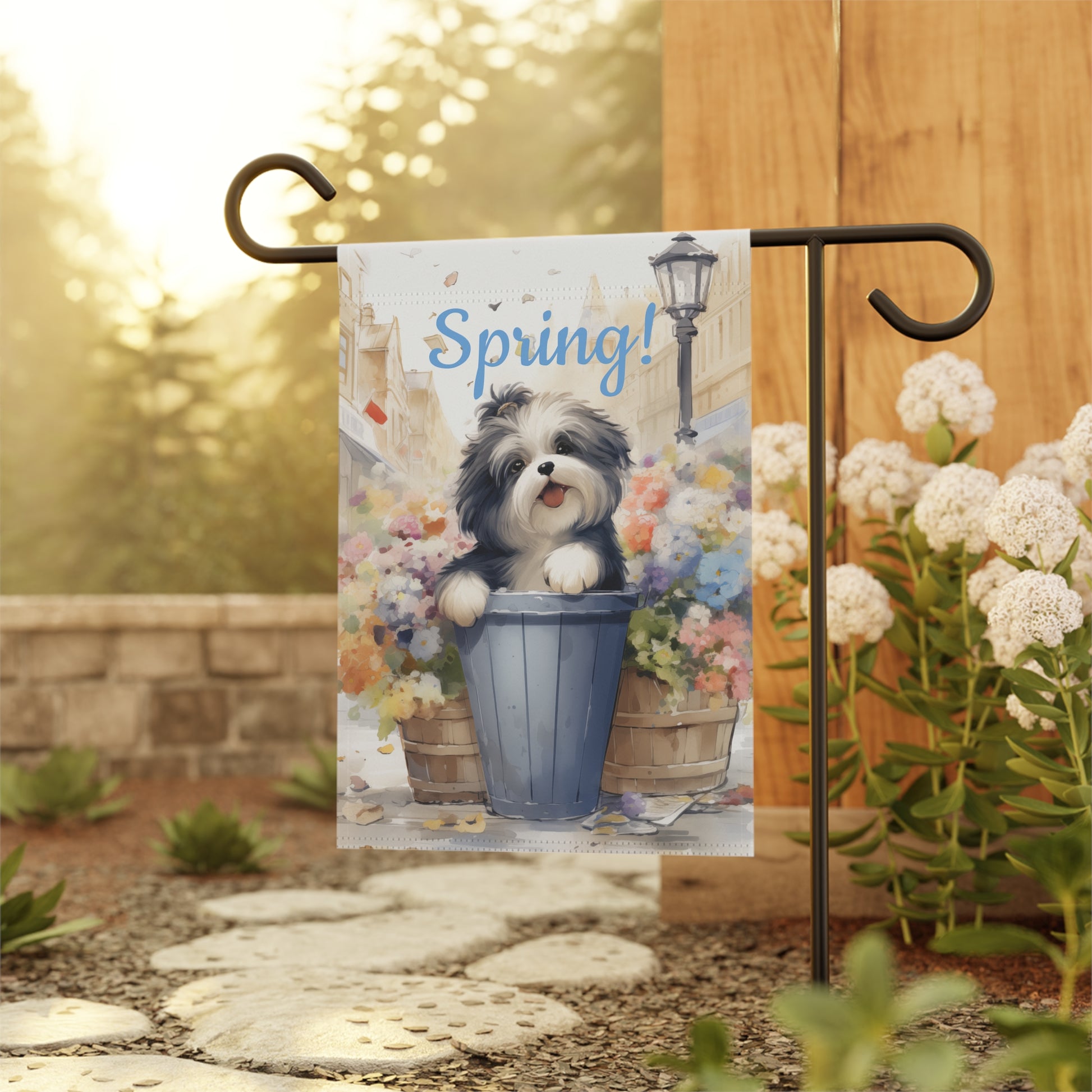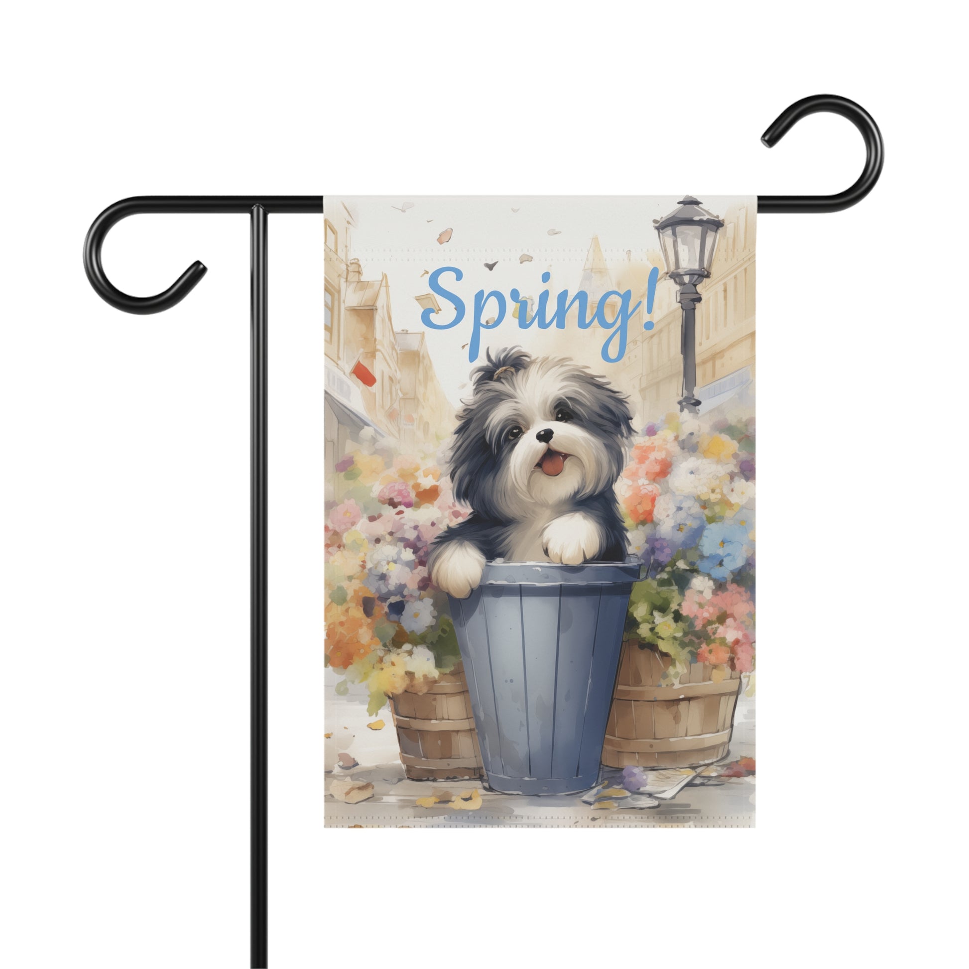 "Spring!" Garden Flag with Cute Dog in Flower Pot
