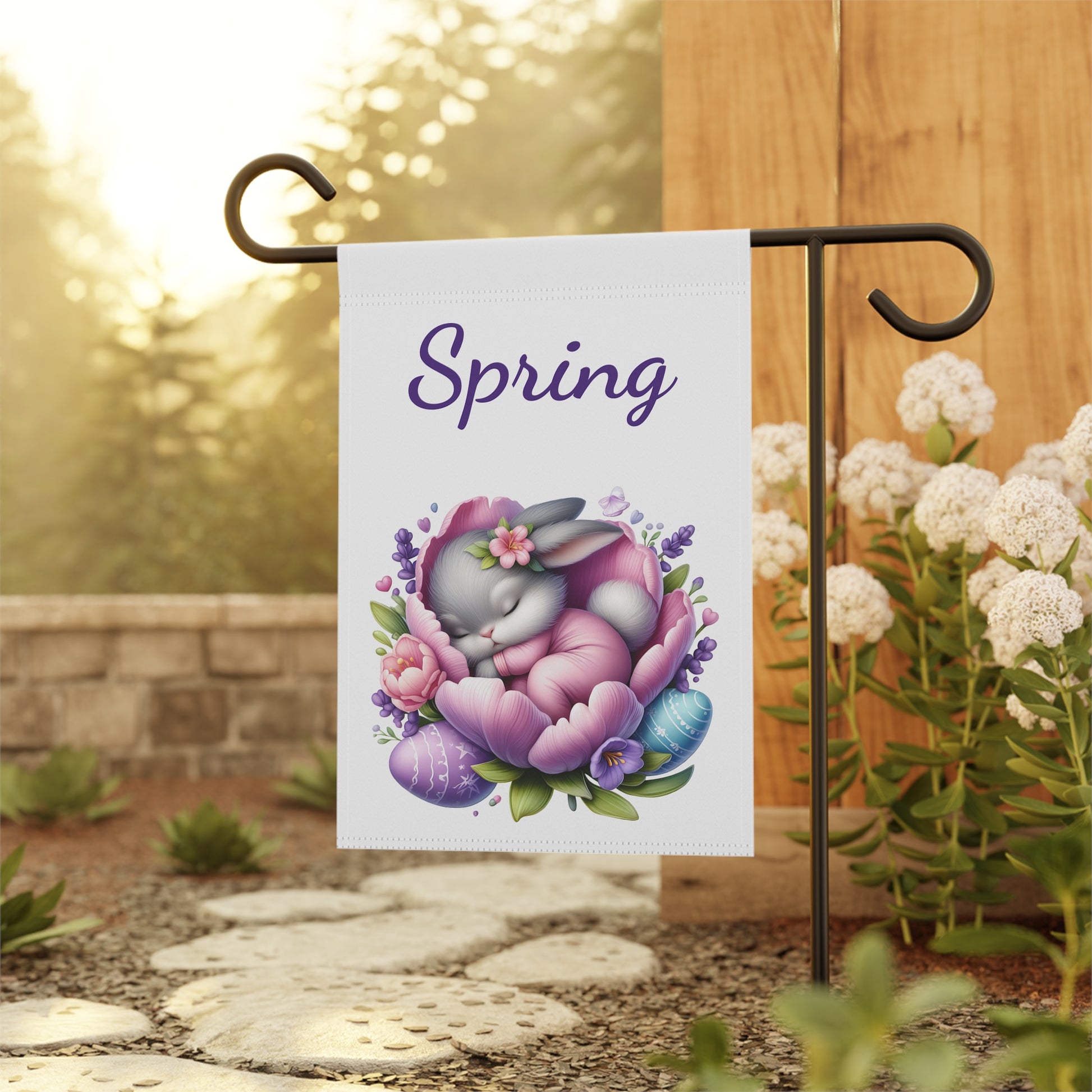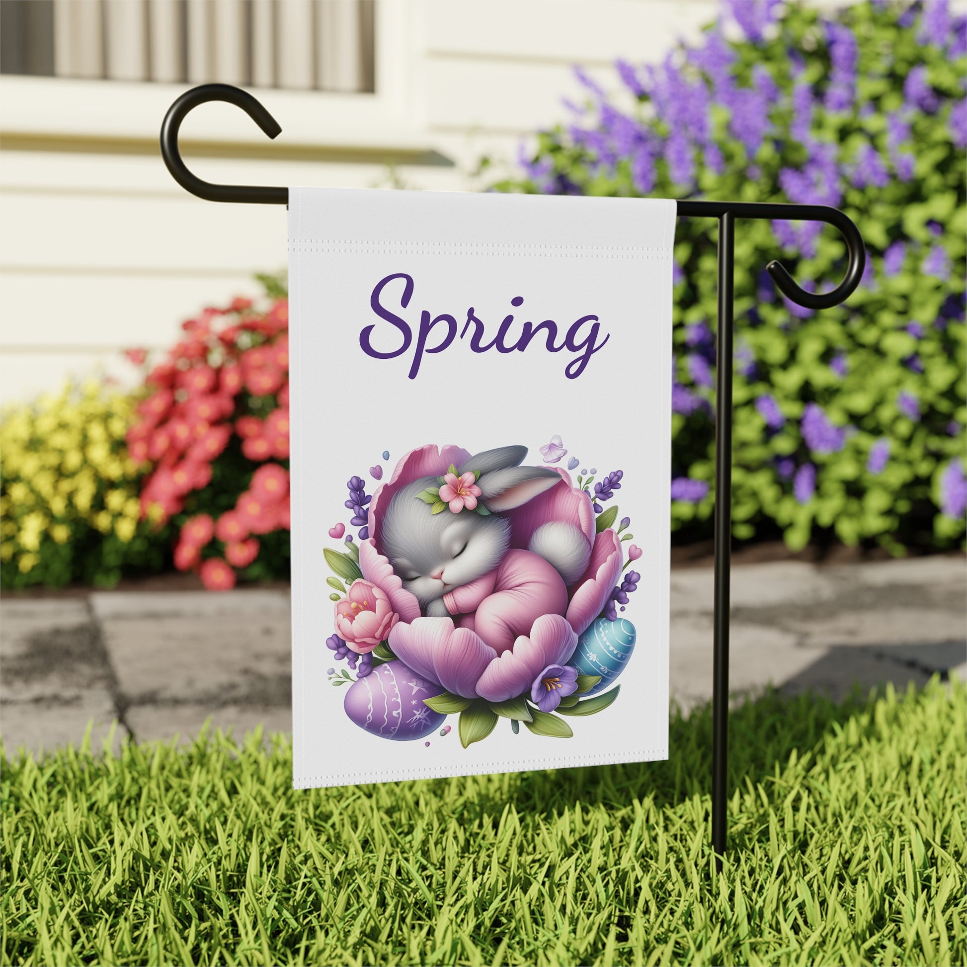 Celebrate the gentle beauty of spring with our charming Sweet Dreams Bunny & Easter Eggs Garden Flag! This delightful flag features an adorable gray bunny rabbit in pink pajamas, sleeping peacefully within a large, vibrant pink and purple flower. Decorated Easter eggs and delicate spring flowers surround the scene, with the word "Spring" elegantly displayed above. It's the perfect way to add a touch of whimsy, cuteness, and festive spirit to your outdoor space, welcoming the season with a serene and heartwarming display. Made from durable, weather-resistant material, this garden flag is designed to withstand the elements and maintain its vibrant colors season after season. Easy to hang on any standard garden flag pole (not included), it's a beautiful addition to your front yard, garden, patio, or entryway.