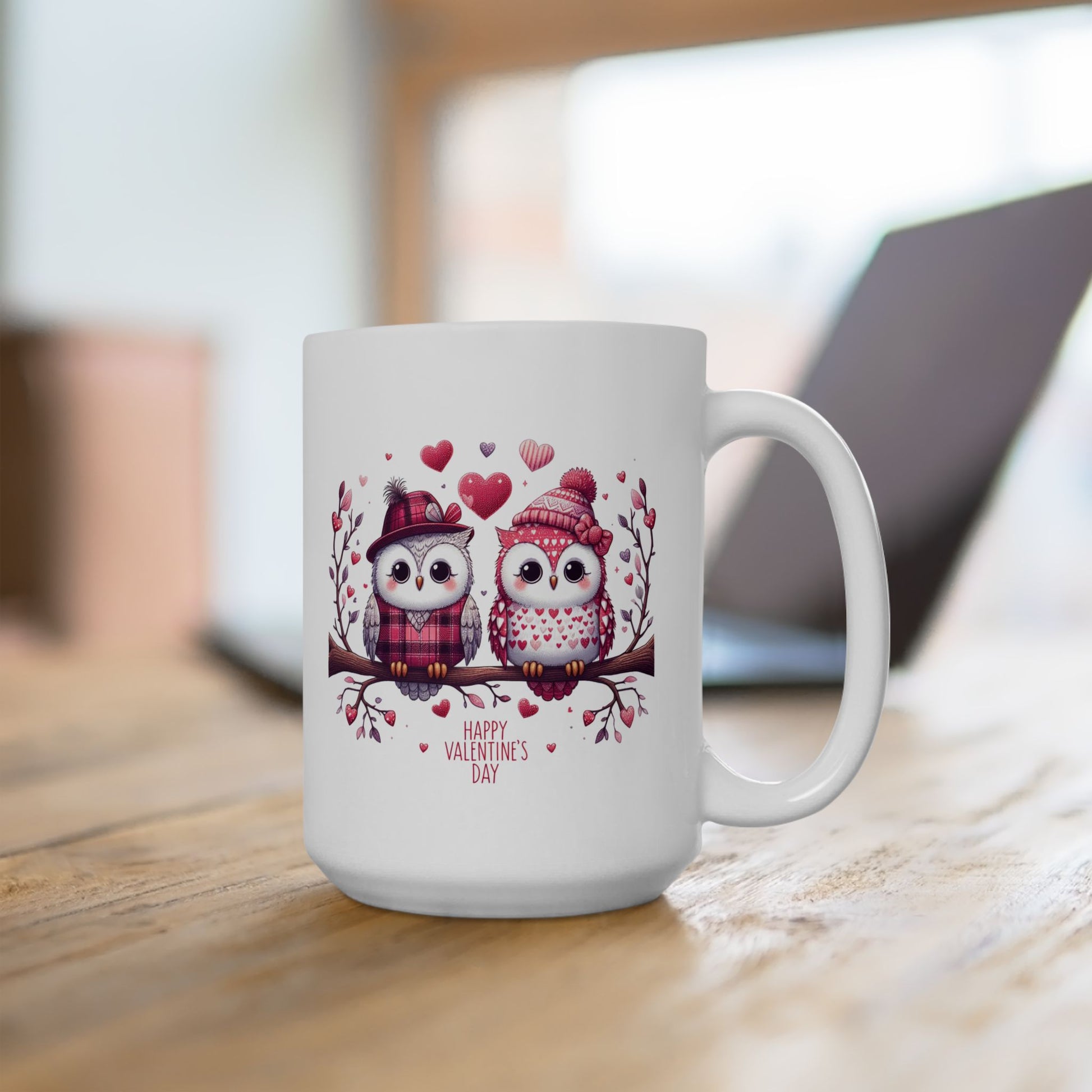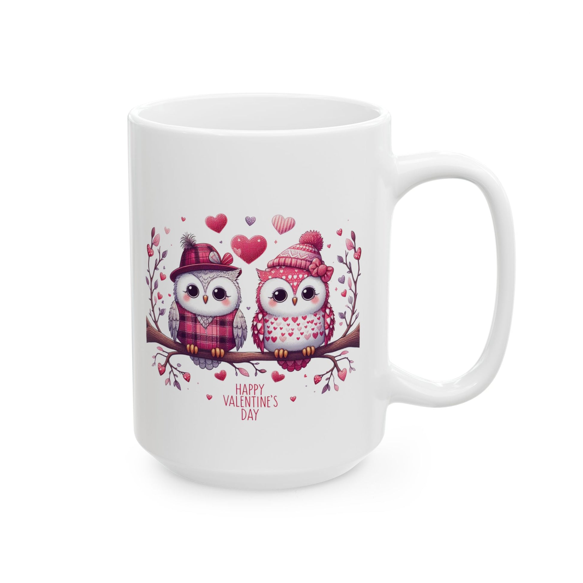 Share a warm moment with our "Happy Valentine's Day" owl coffee mug. This charming white ceramic mug features an adorable illustration of two owls perched on a branch, dressed in cozy winter hats and scarves, surrounded by hearts. The heartwarming "Happy Valentine's Day" message makes it a perfect gift for your sweetheart, family member, or friend. Made with high-quality, durable ceramic, this mug is both microwave and dishwasher safe, ensuring it's a practical and cherished item for daily use. It's an ideal way to enjoy your favorite hot beverages and celebrate the season of love.
