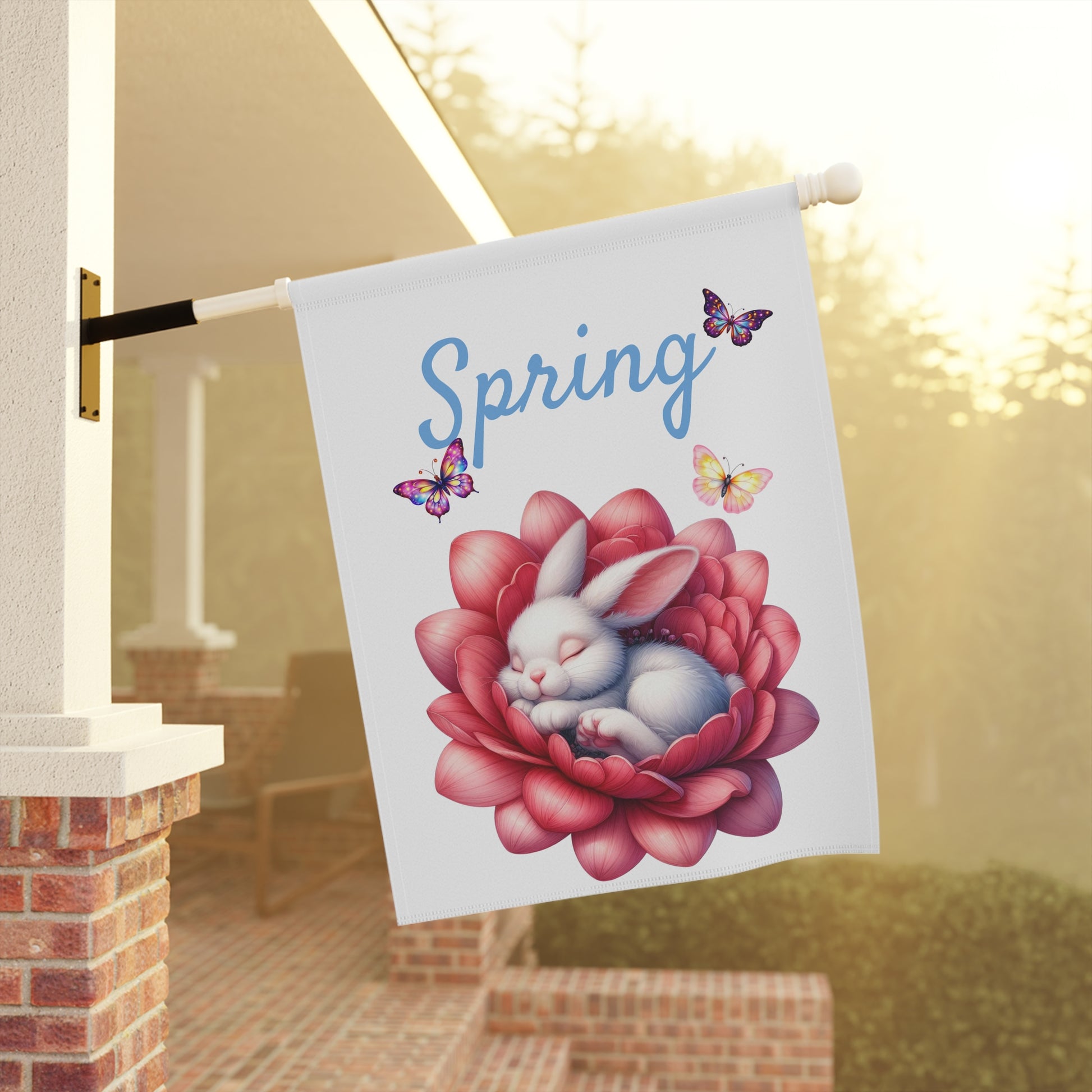 Welcome the gentle beauty of spring to your home with our enchanting Sweet Sleeping White Bunny Spring Garden Flag! This delightful flag features an adorable white bunny peacefully nestled in a vibrant pink flower, surrounded by whimsical butterflies. It's the perfect way to add a touch of charm and warmth to your outdoor space for the spring season or as a lovely accent for Easter. Made from durable, weather-resistant material, this flag is designed to withstand the elements and maintain its vibrant colors. Easily fits most standard garden flag stands.
