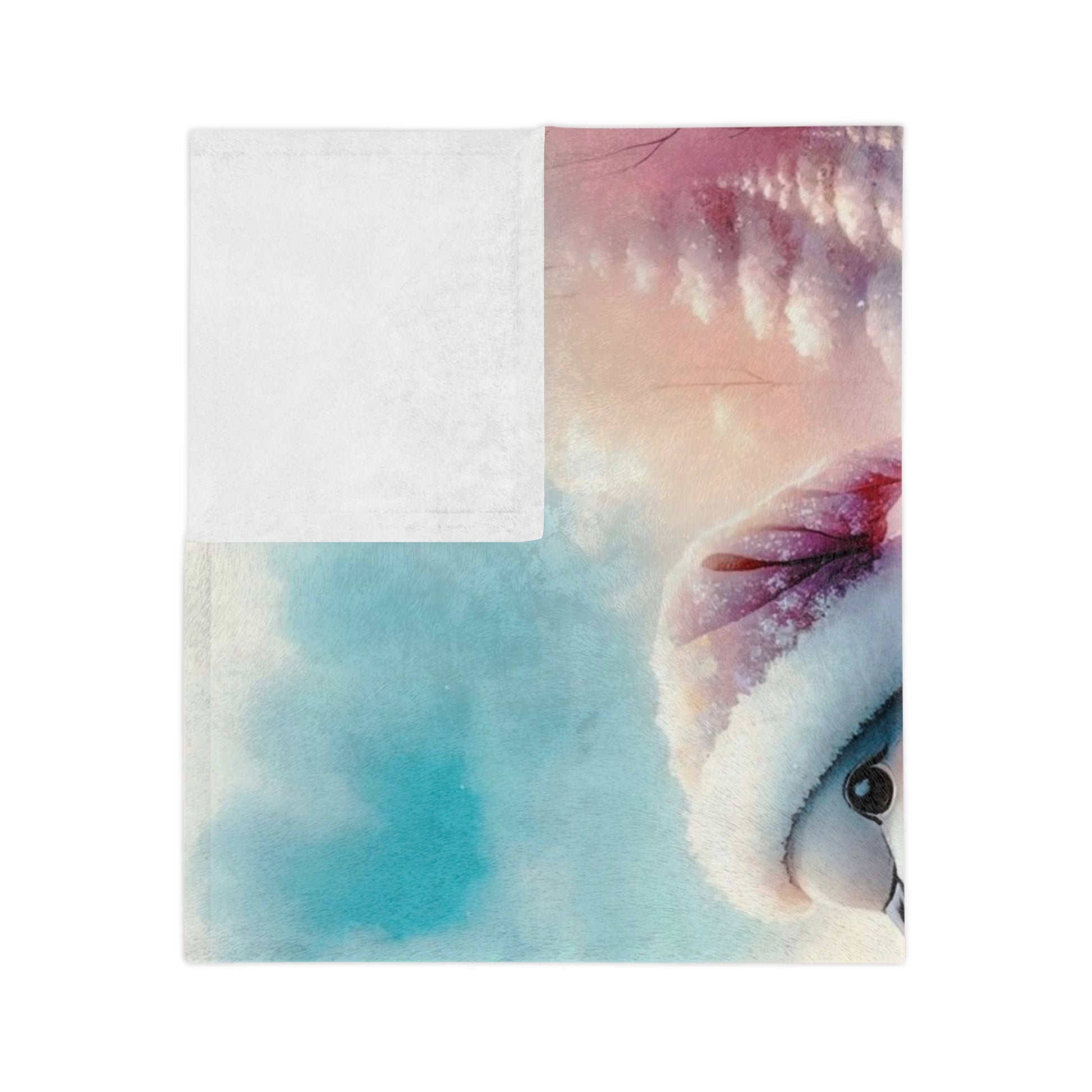 Snuggle up in sweet winter charm with our Sweet Winter Birds Velveteen Blanket. This super-soft, lightweight blanket is a perfect way to add a loving and festive touch to your holiday decor. The heartwarming illustration features two adorable birds wearing Santa hats, nestled together in a snowy, whimsical landscape with soft pastel skies and cozy winter cottages in the background. One bird is also wearing a cute red scarf. A fantastic gift for couples, bird lovers, or anyone who appreciates sweet holiday scenes and cozy comfort.