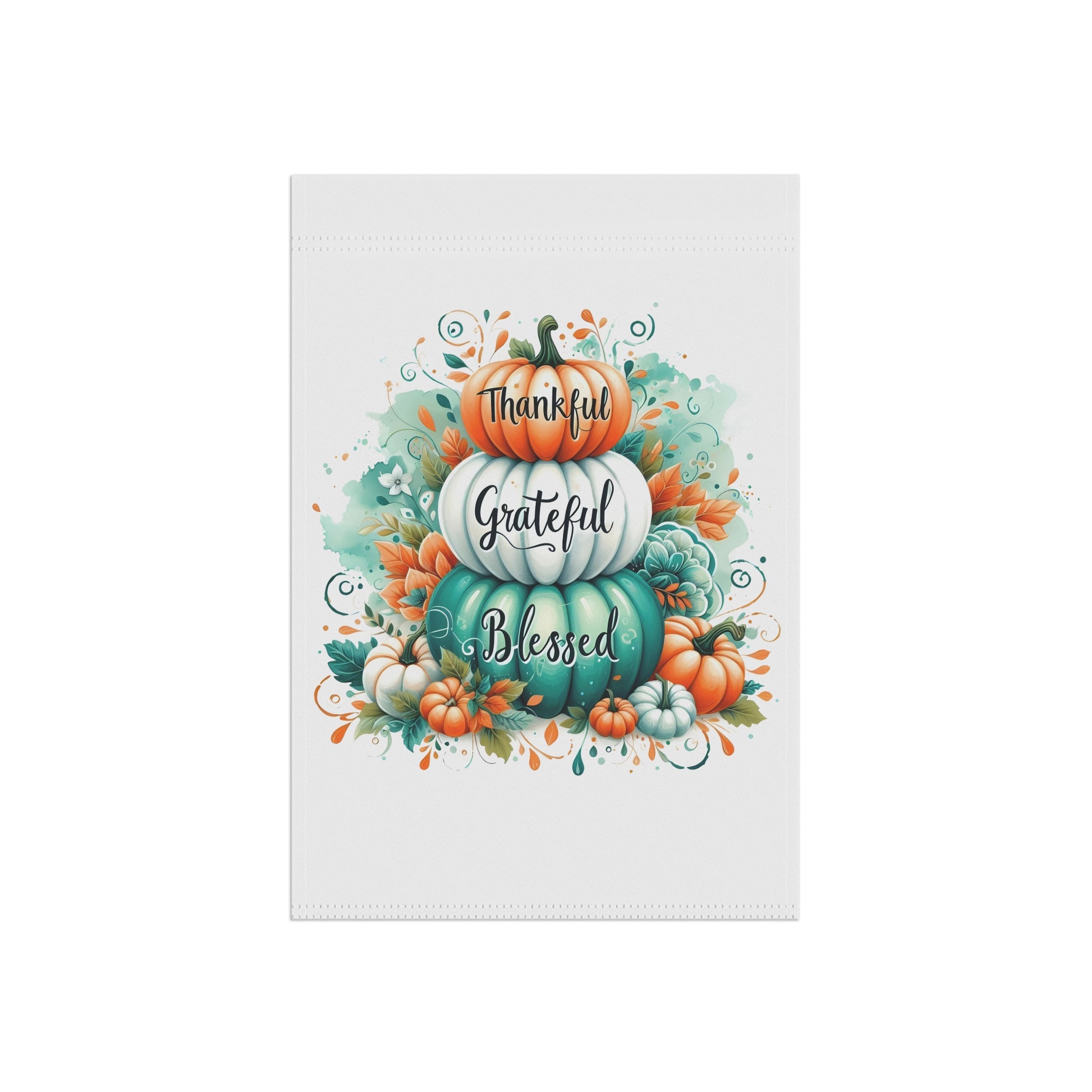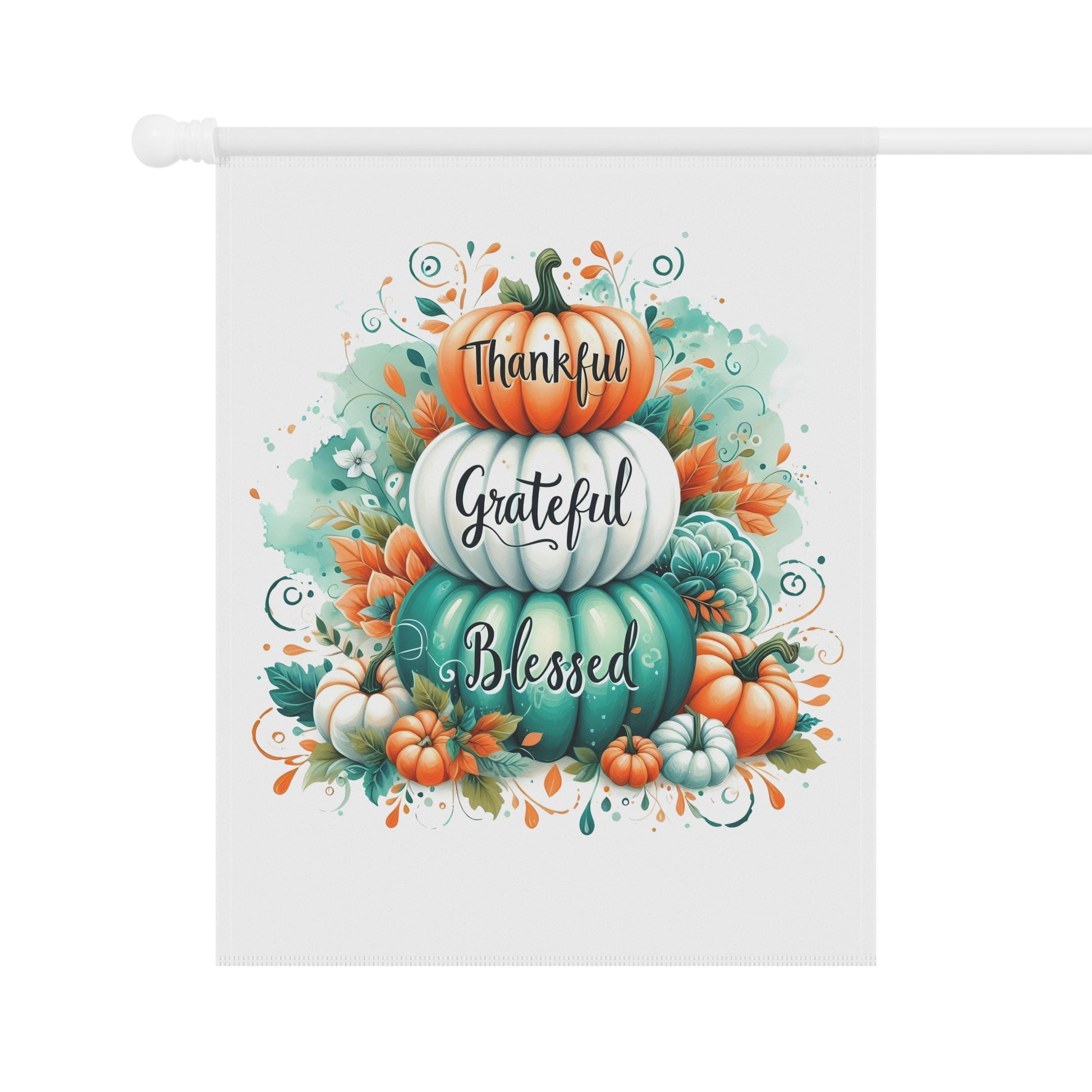 Express your gratitude this season with our heartwarming "Thankful Grateful Blessed" garden flag! This charming flag features a beautifully illustrated stack of pumpkins in shades of orange, white, and teal, surrounded by whimsical fall foliage. Each pumpkin is adorned with a word: "Thankful," "Grateful," and "Blessed," making it a perfect reminder of the season's true spirit. Ideal for Thanksgiving decor, fall celebrations, or simply to add a touch of heartfelt charm to your outdoor space.