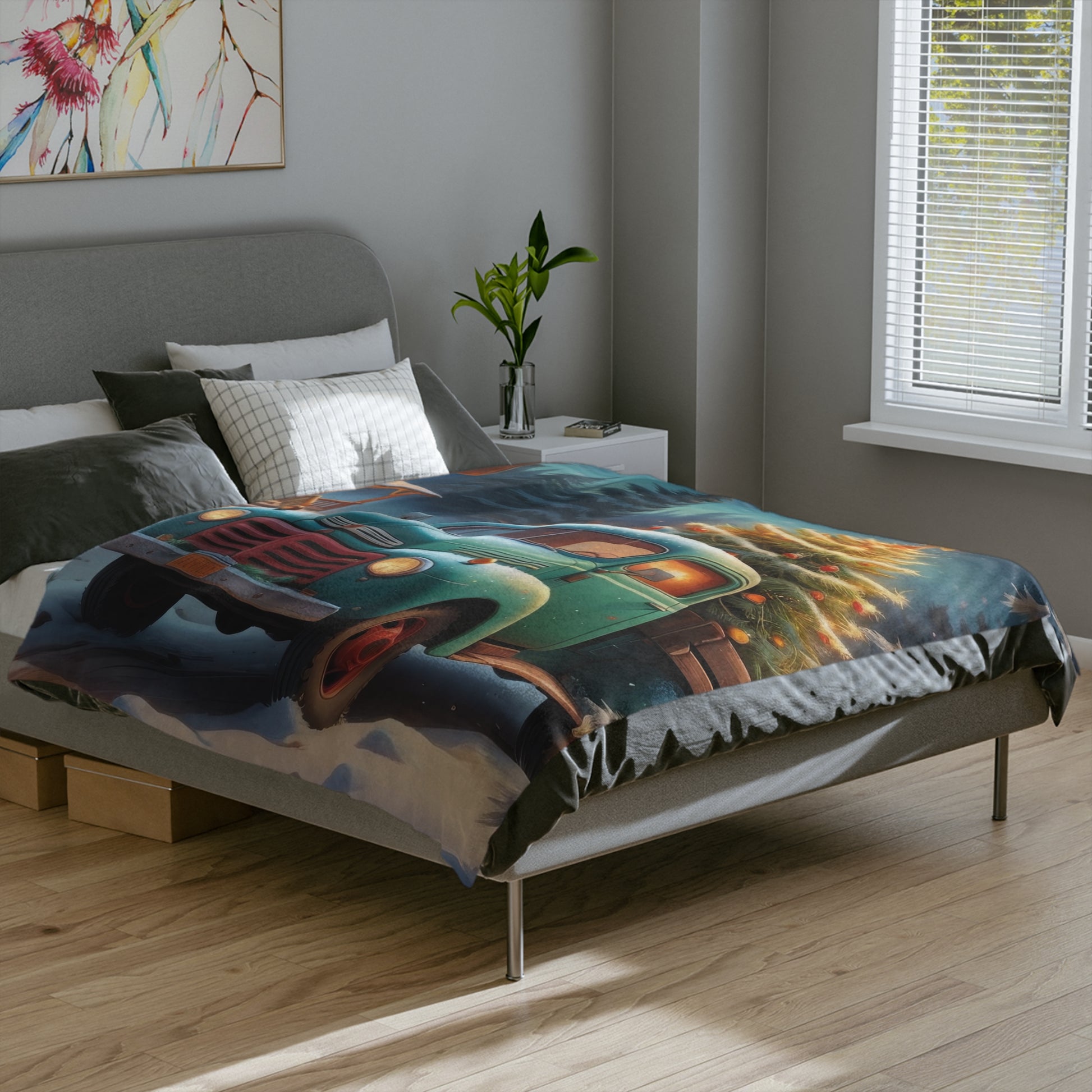 Capture the warmth of holiday nostalgia with this Vintage Christmas Truck Velveteen Plush Blanket. Featuring a classic green pickup truck parked in front of a cozy cabin, with a glowing Christmas tree in the bed, this soft throw blanket brings rustic holiday charm to your home décor. Perfect for cuddling by the fireplace, decorating your living space, or gifting to vintage lovers and Christmas enthusiasts.