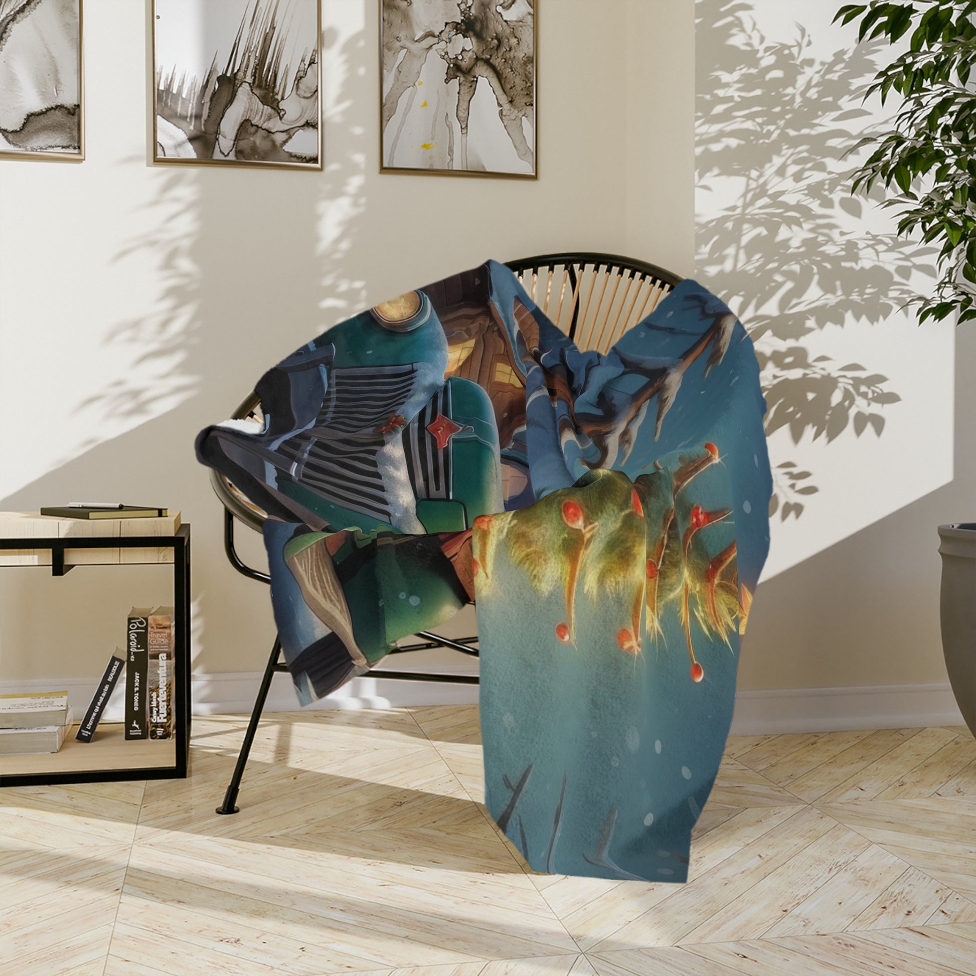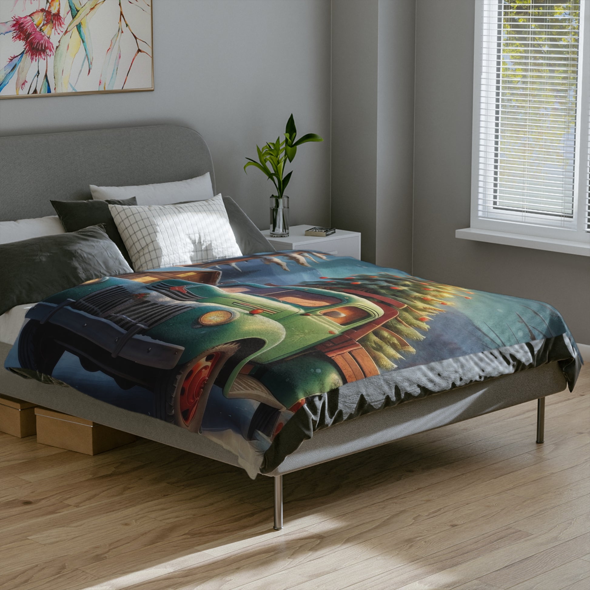 Add a touch of nostalgic charm to your holiday season with this Velveteen Plush Blanket featuring a classic green pickup truck carrying a beautifully decorated Christmas tree. Set against a peaceful snowy cabin backdrop in the mountains, this heartwarming scene brings warmth, tradition, and festive spirit into your home. This blanket is perfect for cozying up by the fire, decorating a guest room, or gifting to someone who loves vintage holiday style.