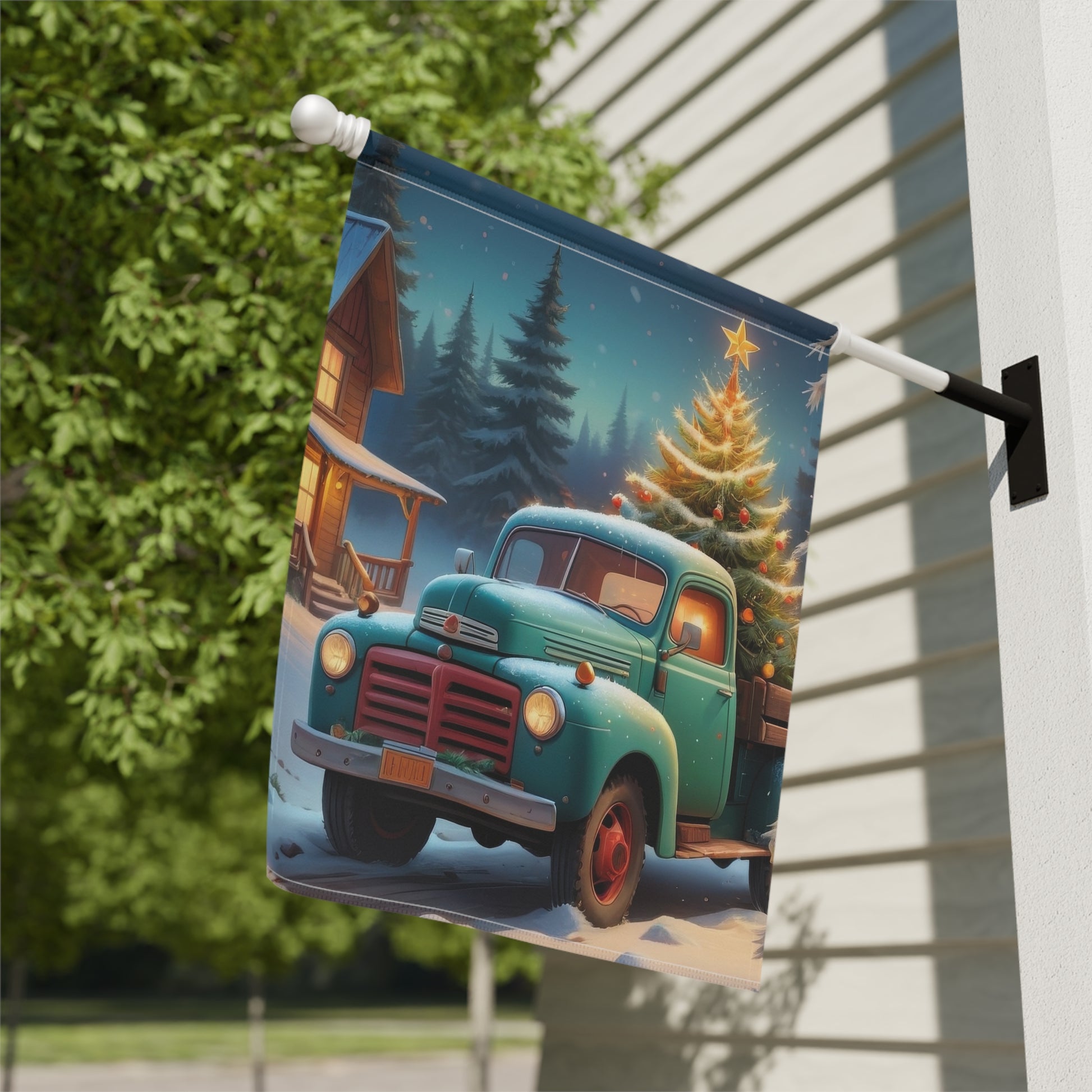 Transport holiday nostalgia to your yard with our charming garden flag featuring an old-fashioned truck hauling a Christmas tree! This festive flag captures classic winter cheer, perfect for adding a touch of rustic charm and heartwarming tradition to your outdoor decor all season long.