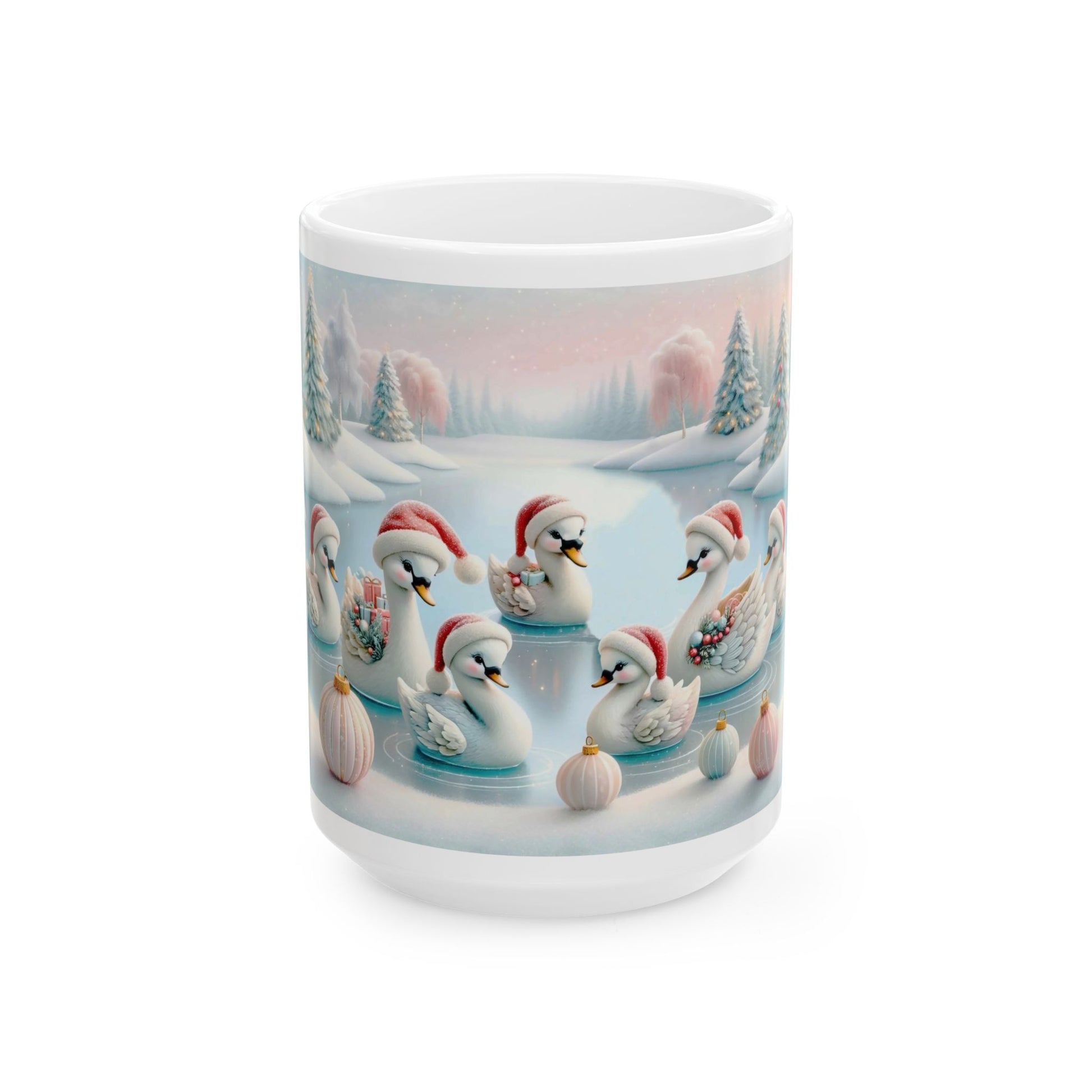 Gracefully celebrate the holiday season with this beautiful Christmas Swans coffee mug! This enchanting design features elegant swans and cygnets wearing festive Santa hats, swimming in a serene, icy lake surrounded by a snowy, whimsical landscape. The delicate details and soft color palette make this a truly unique and special mug. It’s a wonderful gift for swan lovers, nature enthusiasts, or anyone who appreciates a touch of festive elegance in their daily routine.