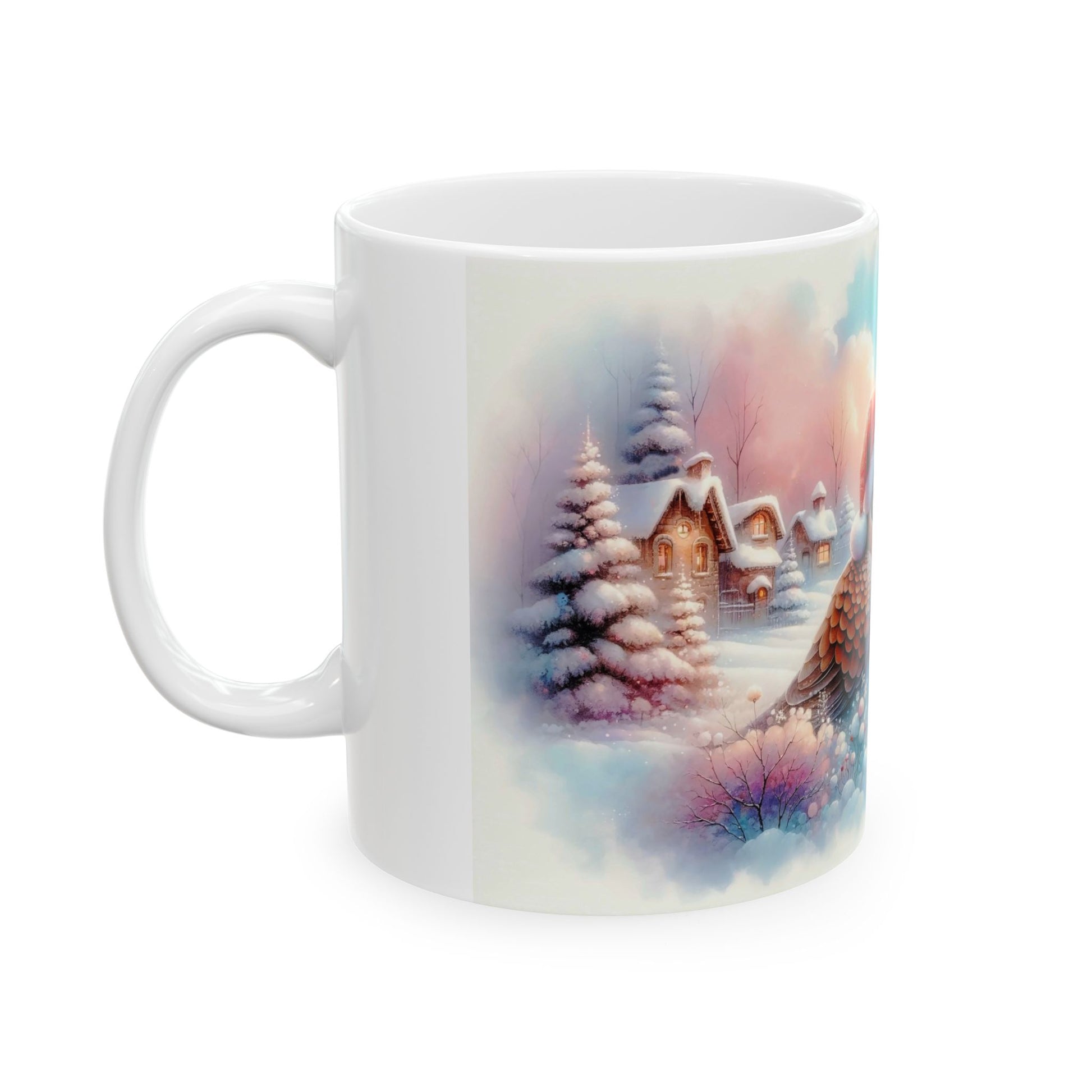 Share a moment of love and warmth this holiday season with this enchanting coffee mug. The beautiful design features two adorable birds facing each other, both wearing Santa hats, in a peaceful, snowy landscape with cozy cabins in the background. The soft, dreamy color palette makes this mug a perfect way to enjoy your favorite hot beverage with someone special. It's an ideal gift for couples, loved ones, or anyone who cherishes the gentle magic of the holidays.
